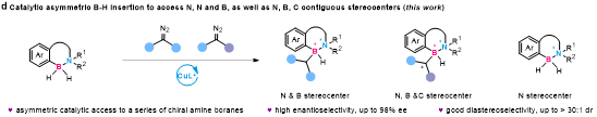 近日,张观副教授与福州大学宋秋玲教授、南方科技大学余沛源教授合作报道了一种铜催化的外消旋胺硼烷与二芳基重氮甲烷之间的不对称B-H插入反应,该反应成功构建了相邻的氮-硼立体中心以及氮-硼-碳连续立体中心骨架。此外,通过动力学拆分过程,可制备出光学纯的硼配位氮中心手性化合物。实现了不同类型原子连续手性中心的高效构建,拓展了手性化合物的多样性,为复杂手性分子的合成提供了新方法。该研究工作在国际权威期刊Nature Communications上发表题为“Catalytic asymmetric constructions of nitrogen, boron and carbon continuous stereogenic centers”。