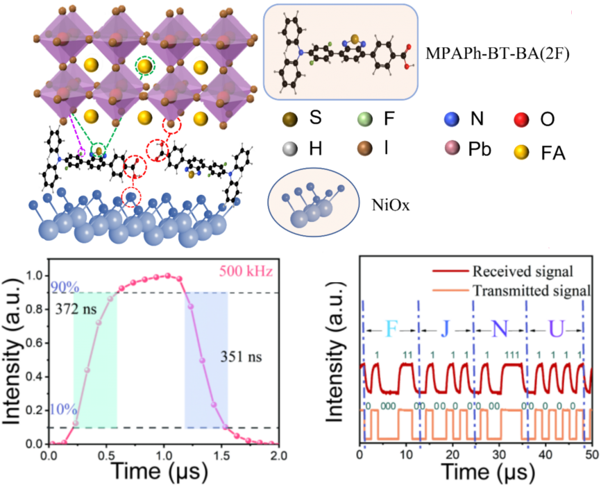 针对这一挑战,J9·九游会「中国」官方网站海峡柔性电子(未来科技)学院王越副教授采用D-A型分子MPA2FPh-BT-BA(简称2F)对NiOx/钙钛矿埋底界面进行修饰。该分子利用其给体-受体结构中的高效锚定基团与NiOx表面紧密结合,有效减少了镍空位缺陷;同时,分子骨架通过氢键和配位作用与钙钛矿前驱体相互作用,在埋底界面处诱导形成高质量钙钛矿薄膜,实现了结晶取向调控与界面缺陷同步钝化。基于此策略,团队成功制备了高性能p-i-n结构钙钛矿光电二极管,在自供电模式(0 V)下表现出优异性能:350-830 nm光谱范围内,响应度超过0.2 A/W、比探测率大于1012 Jones;在7.5 mm2的有效面积下,响应速度达到372 ns(上升时间)和351 ns(下降时间)。此外,团队还制备了不同有效面积(1.875 - 43.2 mm2)的器件,验证了该策略的普适性。这些高性能器件成功应用于光通信系统,成功传输ASCII编码字符“FJNU”,充分证明了其在高速光通信领域的应用潜力。该成果以High-performance perovskite photodiode with homogeneous crystallization and buried interface passivation for ultrafast optical communication为题发表于国际学术期刊《Materials Today Chemistry》。