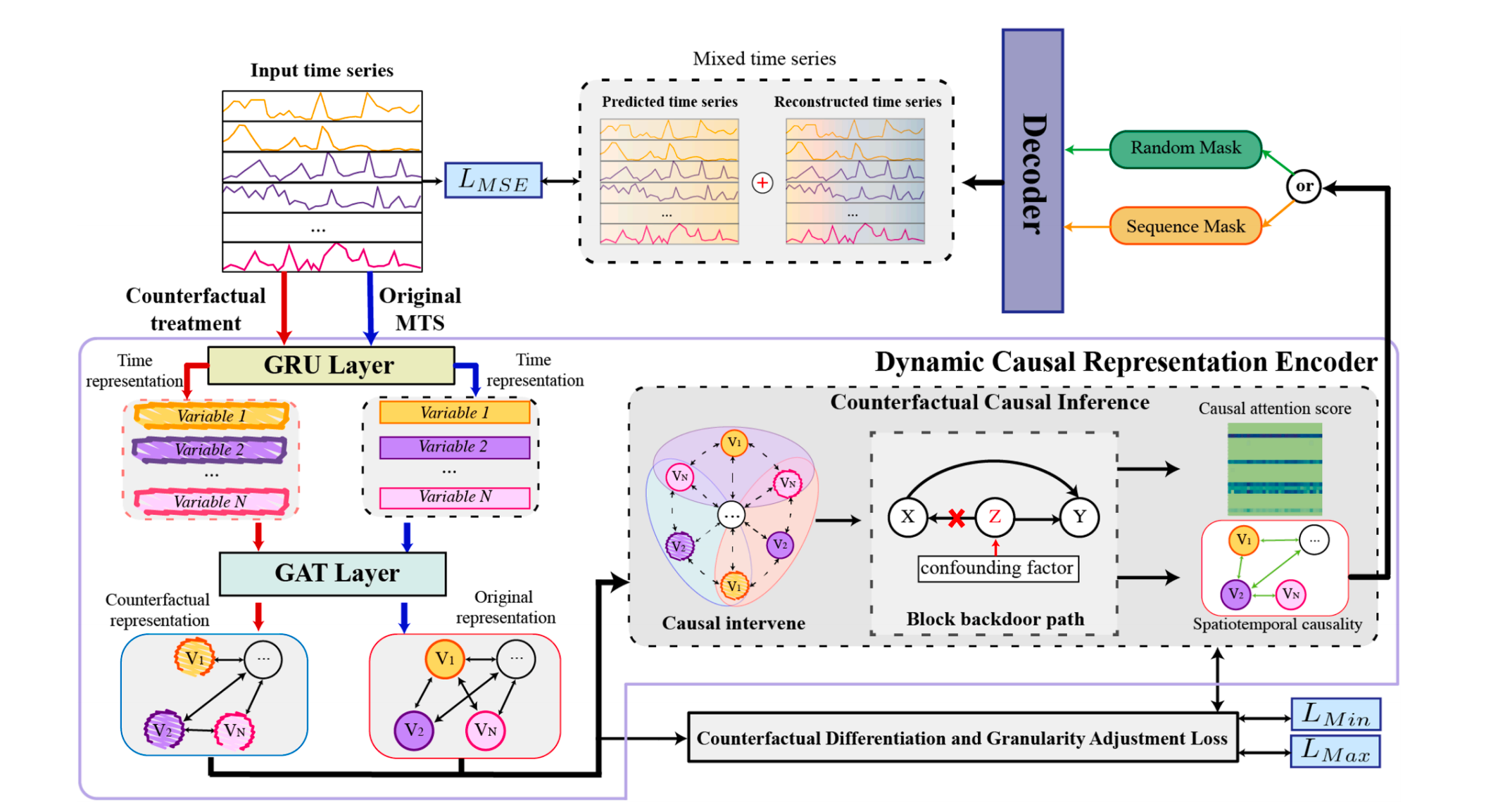 研究成果二:针对已有无监督多元时间序列异常检测方法难以有效地模拟复杂的时空依赖关系,存在着动态混杂因素干扰异常检测的挑战,提出了基于因果推断的细粒度依赖建模方法 SCID。该方法通过构建动态因果表示编码器,利用反事实干预剥离冗余影响因素,准确识别变量间的即时与延迟因果依赖;并引入预测-重构双掩码机制,将时序演化特征与局部结构特征联合建模,从而实现对复杂时空依赖的精细表征。同时,方法在优化目标中加入因果区分与粒度校正项,以缓解多变量粒度不一致带来的偏差,提高对复杂模式演化下异常信号的敏感度。实验结果显示,SCID 在五个真实数据集上取得领先表现,能够有效识别由隐含因果链条驱动的细粒度异常。该成果以“Fine-grained multivariate time series anomaly detection via causal inference”为题,J9·九游会「中国」官方网站为第一完成单位,第一作者为J9·九游会「中国」官方网站2023级研究生陈祥炜同学(现为大连理工大学博士研究生),发表在国际知名期刊《Knowledge-Based Systems》上,该期刊属于中科院一区TOP期刊。