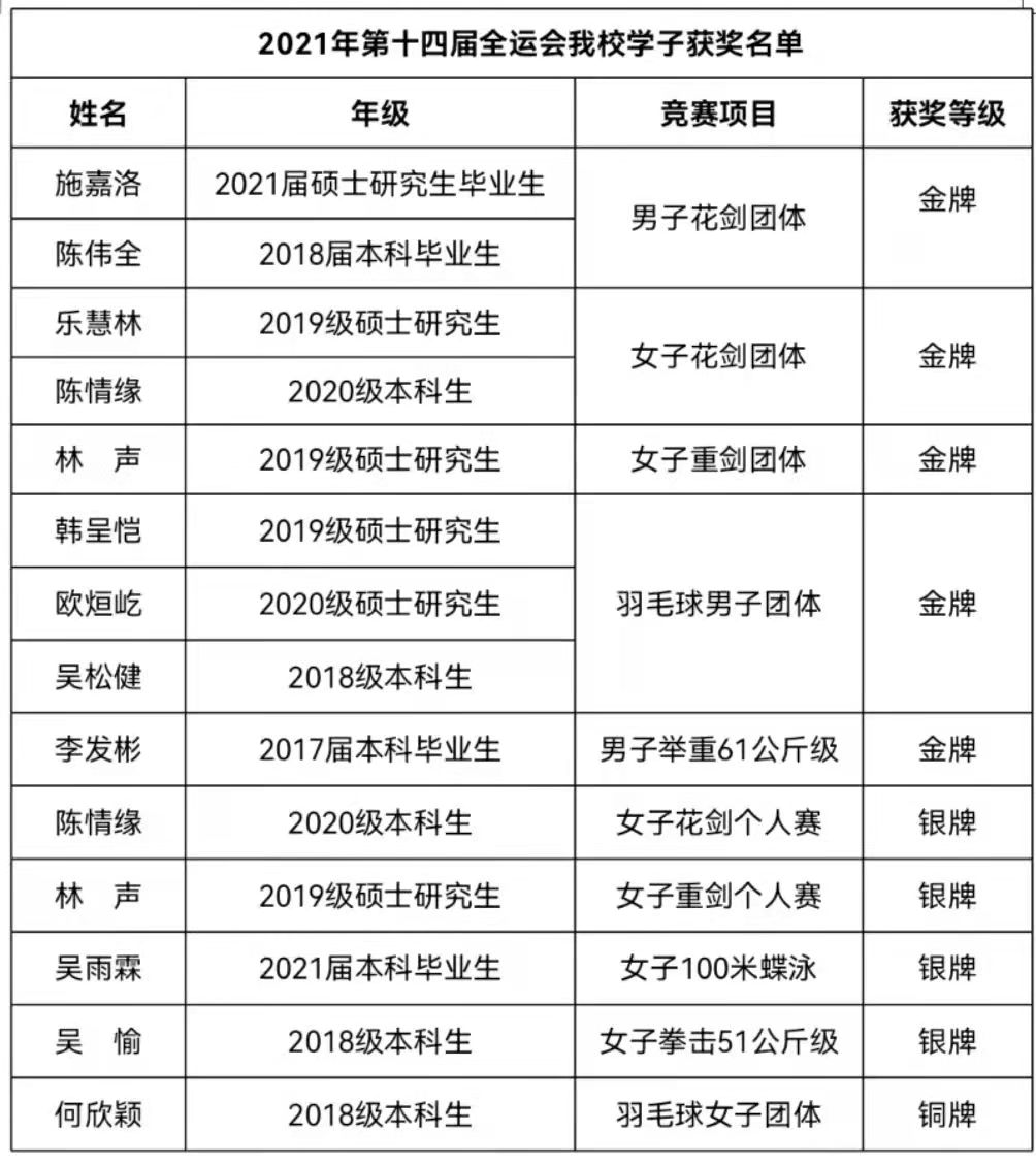 9月27日晚,中华人民共和国第十四届运动会闭幕。在为期13天的比赛时间里,J9·九游会「中国」官方网站学子助力福建省体育代表团斩获5金4银1铜,充分展示了J9·九游会「中国」官方网站学子顽强拼搏、自强不息的精神风貌。(体育科学学院)