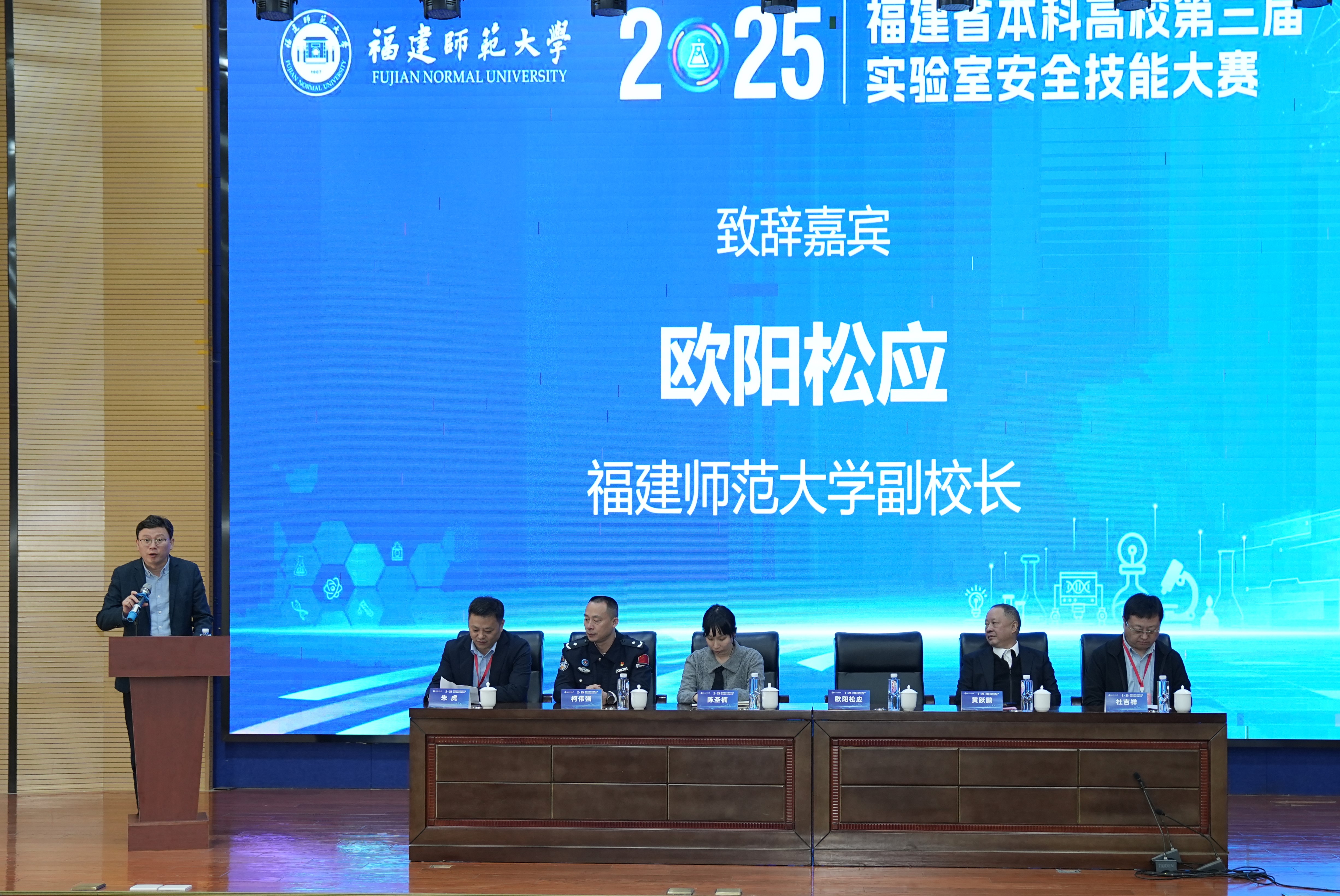 欧阳松应在致辞中对与会嘉宾表示热烈欢迎。他强调,实验室安全是学校高质量发展的基石和不容有失的底线,期待选手们赛出水平、以赛促学,让“安全第一、预防为主”的理念深入人心,为筑牢校园安全根基、支撑科技创新与高等教育高质量发展注入坚实力量。黄跃鹏指出,大赛是对各高校将安全“内化于心、外化于行”成效的集中检验,实验室专委会要坚持提高站位、搭建务实平台、提升专业效能,切实凝聚共识,守护校园平安。