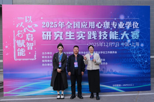12月7日,在2025年全国应用心理专业学位研究生实践技能大赛全国总决赛中,心理学院应用心理专业学子凭借扎实的专业功底与出色的实践能力,取得优异成绩。2024级研究生戴哲敏(指导老师:刘洋)在心理科普作品创作赛道荣获一等奖;2023级研究生张舒婷(指导老师:刘洋)在心理咨询/心理治疗面谈技能赛道荣获二等奖;2024级研究生王晨欣(指导老师:许艳凤)在应用心理方案/产品设计赛道荣获二等奖。(心理学院)