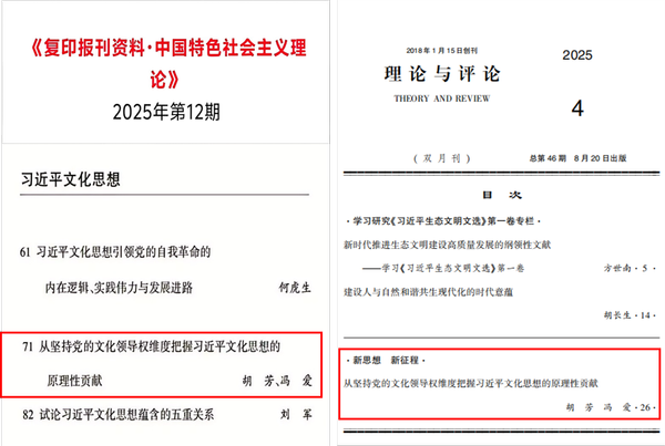 近日,《理论与评论》2025年第4期刊发的《从坚持党的文化领导权维度把握习近平文化思想的原理性贡献》一文,被《人大复印报刊资料•中国特色社会主义理论》(2025年第12期)全文转载,彰显了《理论与评论》在相关领域的学术公信力与理论影响力。