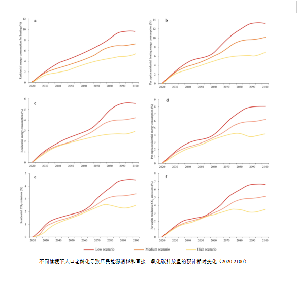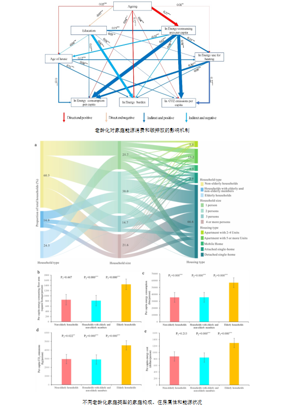 当前,气候变化与人口老龄化已成为全球人类社会共同面临的重大挑战。但两者之间的内在关联、互动机制以及长期演化路径仍未在国际上得到充分研究与认知。为此,研究团队基于24,000多户的美国家庭调查数据,通过分析发现:老龄化是驱动美国住宅能源消费与碳排放增长的重要因子,其影响机制主要通过“居住面积”中介变量实现。未来人口情境下,老龄化将推动户均能源消费与碳排放持续增长,且成为区域与种族协调发展的重大挑战。研究填补了当前老龄化环境效应研究中仅聚焦于经济或个体行为视角,而忽视家庭年龄结构与居住模式协同作用的空白,有助于公众与决策者理解人口结构变迁背景下家庭能源消费与碳排放的长期发展路径。
