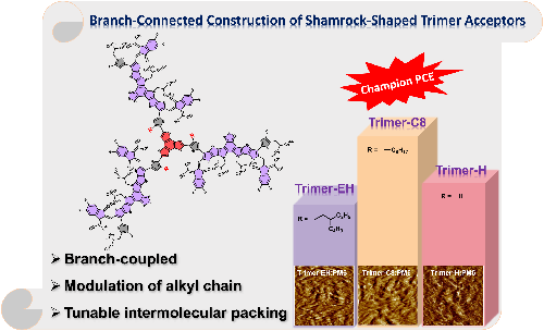 针对上述挑战,J9·九游会「中国」官方网站海峡柔性电子(未来科技)学院马康桥副教授提出了一种全新的三聚体受体材料构筑策略,通过“侧基连接”的方式在侧链方向实现共轭拓展,成功构筑出具有三叶草形几何特征的大分子受体结构。不同于传统依赖端基或中心核连接的设计模式,该策略在保持关键功能单元完整性的同时,为三聚体受体的分子构型与电子结构调控提供了更大的自由度,有利于实现更合理的分子堆积和分子间相互作用调节,为高性能寡聚物及大分子受体材料的设计提供了新的分子工程路径。在该侧基连接体系中,研究者进一步通过引入不同空间位阻的烷基链,对分子平面性、分子间相互作用以及与给体材料的混溶行为进行了系统调控。研究结果表明,适度的空间位阻能够在分子平面性与聚集强度之间建立良好平衡,从而形成更加理想的共混膜形貌和高效的电荷输运通道。该研究清晰揭示了烷基链工程在调控分子间相互作用和器件性能中的关键作用,为高效有机太阳能电池材料的理性设计提供了重要指导。该成果以“Branch-Connected Construction Of Shamrock-Shaped Giant Molecule Acceptors Enables Efficient Organic Solar Cells Through Optimized Molecular Architecture”为题发表于国际学术期刊《Chemical Engineering Journal》。