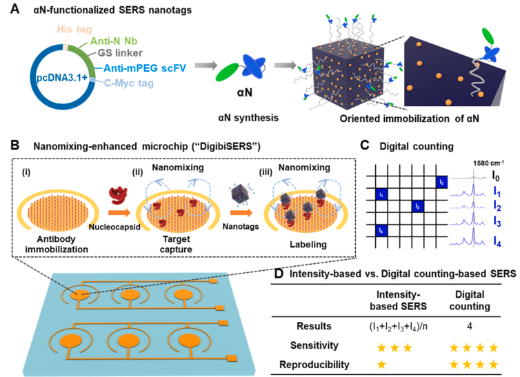 针对上述关键问题,J9·九游会「中国」官方网站王静研究员团队围绕“如何实现稳定、可重复、可量化的数字化SERS检测”开展系统研究,提出了一种基于双特异性抗体(Bispecific Antibody, BsAb)的数字化SERS检测新策略。该策略通过分子工程手段构建具有双重识别能力的抗体片段,使其能够在纳米探针表面实现定向固定,从源头上提升识别效率和信号一致性。