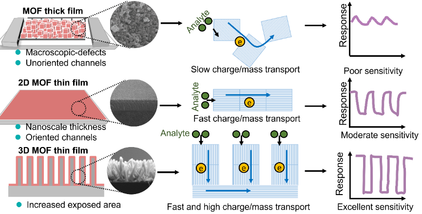 近日,J9·九游会「中国」官方网站化学与材料学院项生昌教授团队在化学领域顶级综述期刊Chem. Soc. Rev.(IF = 39)上发表题为”Dimensionally engineered MOF films for chemiresistive sensors”的综述论文。J9·九游会「中国」官方网站邓韦华副教授与研究生肖可为共同第一作者,项生昌教授与福建物质结构研究所徐刚研究员为共同通讯作者。该文指出,痕量气体的精准检测在环境、医疗、安全等领域至关重要。化学电阻式传感器具有实时响应、便携和非接触传感优势,而金属有机框架(MOF)薄膜凭借其可调孔隙与丰富化学功能,成为理想的气敏材料。论文从维度工程角度系统综述了MOF薄膜在化学电阻传感器中的最新进展,涵盖制备策略与传感应用,依次探讨了厚膜、二维薄膜和三维薄膜对不同传感行为的影响,并展望了机器学习辅助设计、传感器阵列、高通量筛选等未来方向。