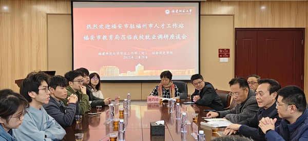 1226日,福安市驻福州市人才工作站相关人员一行来校调研就业工作。福安市驻福州市人才工作站站长戴瑞奇、副站长王瑞清、办公室主任池巧珍,福安市教育局副局长陈立洪、人事科科长林如钦,校关工委副主任郭警修、学生工作部副部长吴志锋、社会历史学院党委副书记范瑞锭等参加调研,相关学院福安籍毕业生代表参加座谈会。