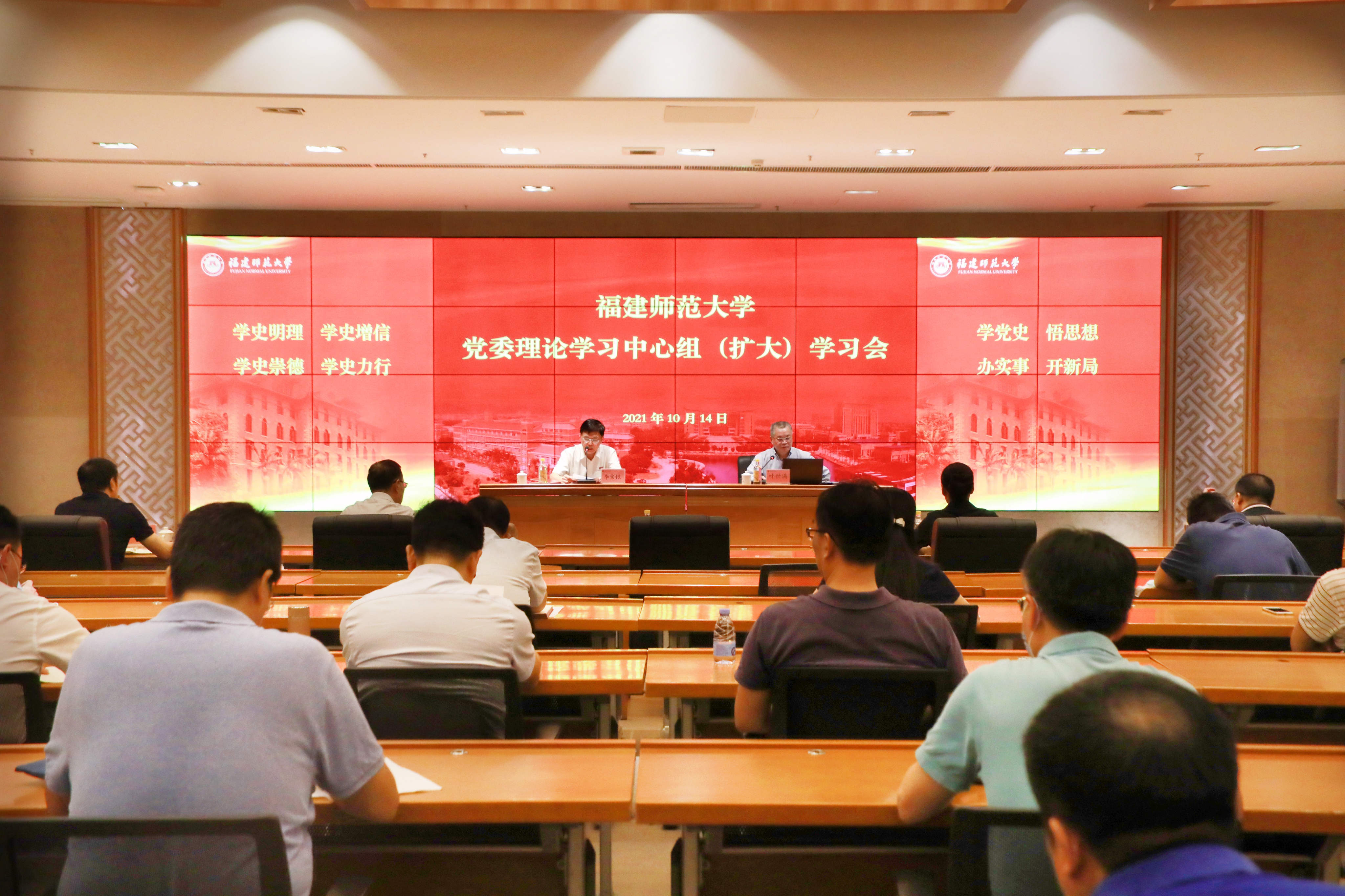 10月14日下午,校党委理论学习中心组(扩大)学习会在旗山校区宏达厅举行,闽江学院党委书记叶世满应邀作题为《深刻领悟 牢记嘱托 勇担使命》的辅导报告。报告会由校党委书记李宝银主持,校领导、全体中层正职干部参加了会议。