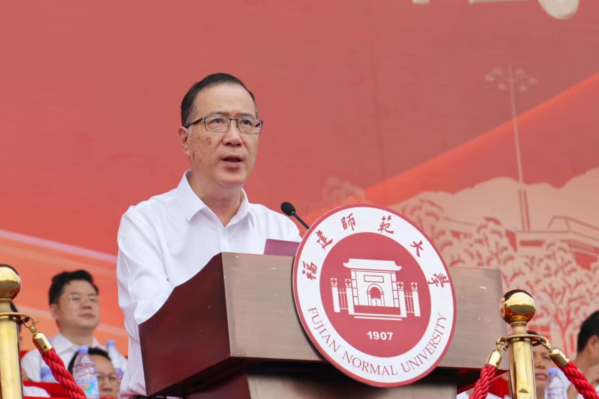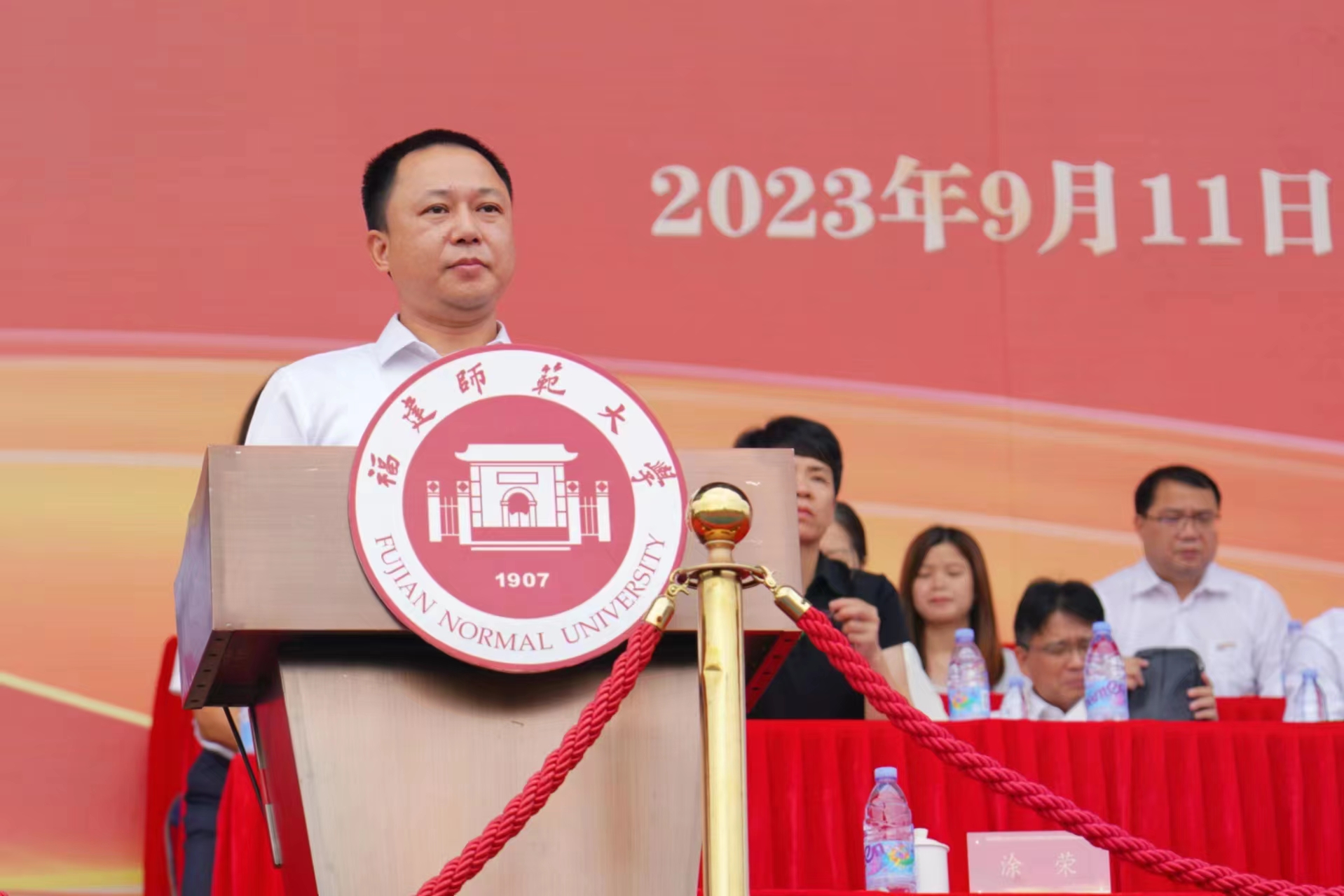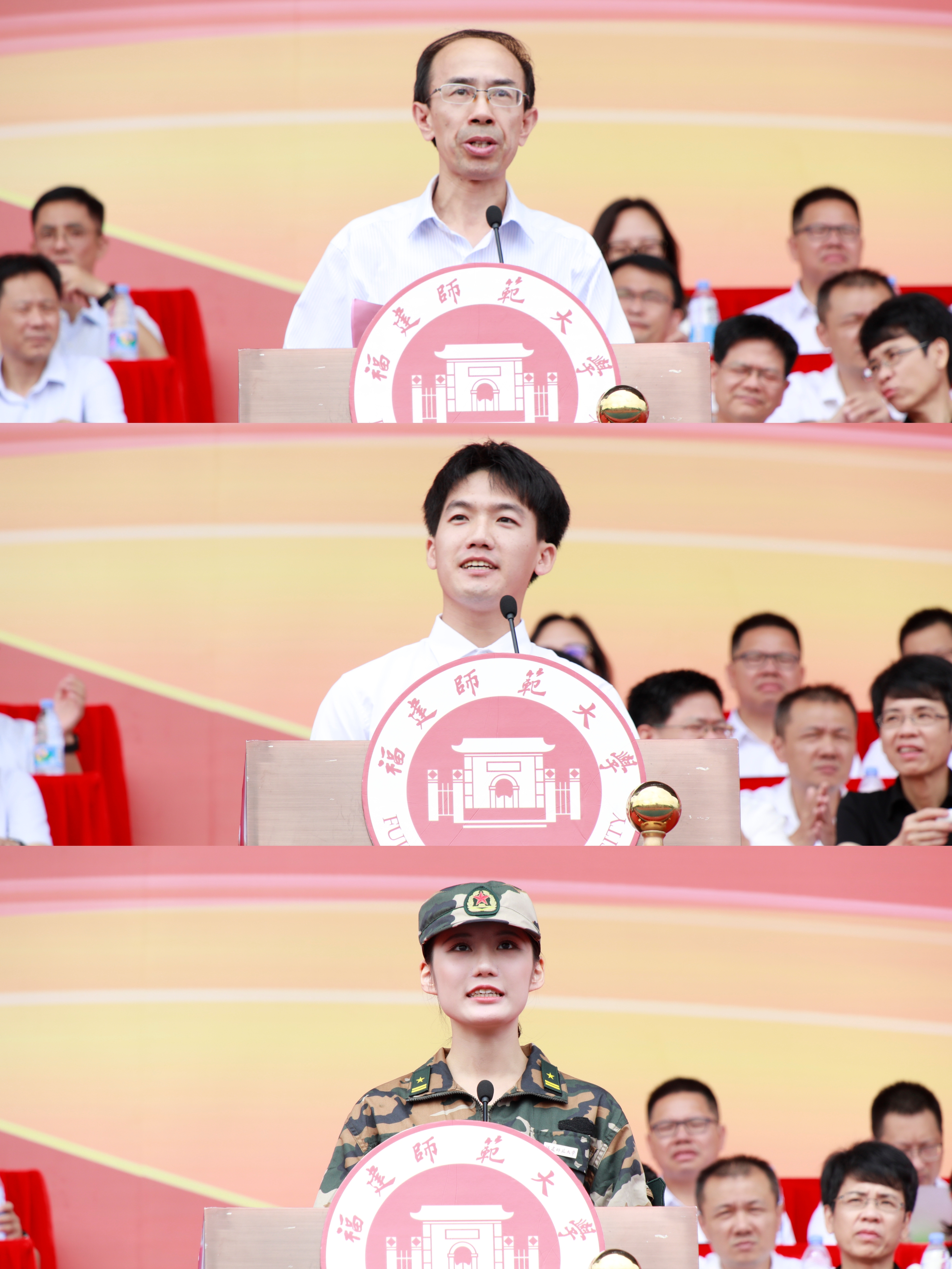典礼在雄壮的国歌声中拉开帷幕。校长王长平教授以“奋斗正青春,筑梦正当时”为题发表了热情洋溢的致辞,代表全校师生员工热烈欢迎2023级新同学加入福建师大这个“大家庭”,并提出三点殷切期望:一要赓续红色血脉,胸怀“国之大者”,大力传承弘扬“福师人”的优秀精神品格,主动融入国家和时代发展的洪流,让家国情怀成为青春最亮丽的底色;二要潜心求知问学,用勤奋书写责任,以行动践行担当,脚踏实地、苦干实干,着力打牢学业根基、练就过硬本领,让笃行致远成为青春最强大的能量;三要矢志探索创新,培养创新思维、拓展未来视野,敢于突破常规、勇于探索未知,奋力攀登学术高峰、推动科技创新,让敢为人先成为青春最澎湃的动力。他希望2023级本科新同学服从命令、听从指挥,严守纪律、刻苦训练,在军训中磨炼意志、砥砺品格,锻造过硬作风、养成良好学风,为大学生活和人生之路打下坚实基础。