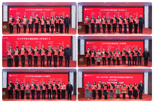 会议表彰了2025年就业创业工作先进集体、个人及毕业生基层就业卓越奖获奖者,五个获奖集体和个人代表在会上交流了工作经验。