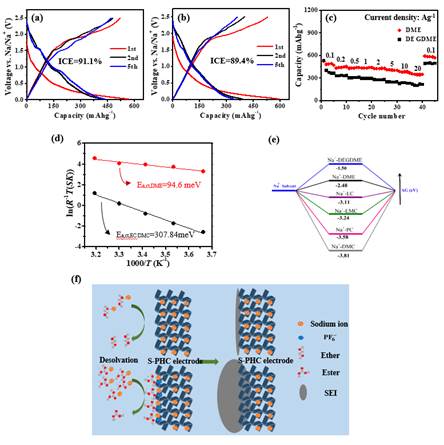 (a, b)使用CMC粘结剂的PNC负极在DME和DEGDME电解液中第1,2,5圈充放电曲线。(c)不同电解液中PNC的倍率性能。(d)在两种电解质中PNC负极的活化能活化能Ea,ct的Arrhenius曲线。(e) PNC材料表面上不同溶剂相应的吸附吉布斯自由能。(f)不同电解液中钠离子迁移和去溶剂化过程的示意图。