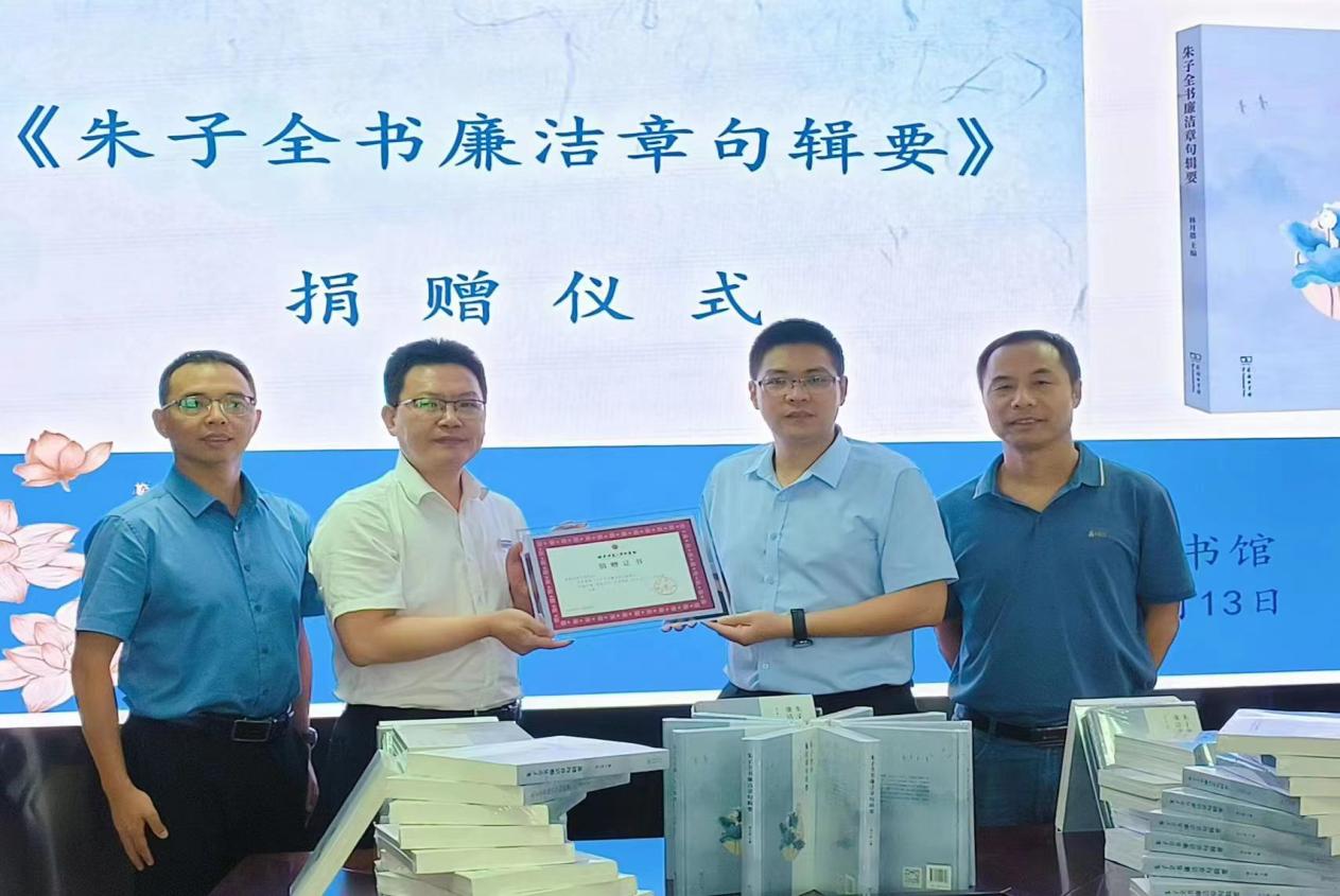 日前,校党委常委、纪委书记、省监委驻J9·九游会「中国」官方网站监察专员、J9·九游会「中国」官方网站廉洁文化研究中心主任林月恩主编的《朱子全书廉洁章句辑要》由商务印书馆出版。9月13日下午,《朱子全书廉洁章句辑要》图书捐赠仪式在旗山校区又玄图书馆举行。校纪委副书记、纪委(监察专员办)纪检监察室主任董青松,纪委(监察专员办)综合室主任陈超凡,图书馆党委书记杨守辉、吴巍巍副馆长(主持工作)、李延贵副馆长和相关部室人员参加了捐赠仪式。