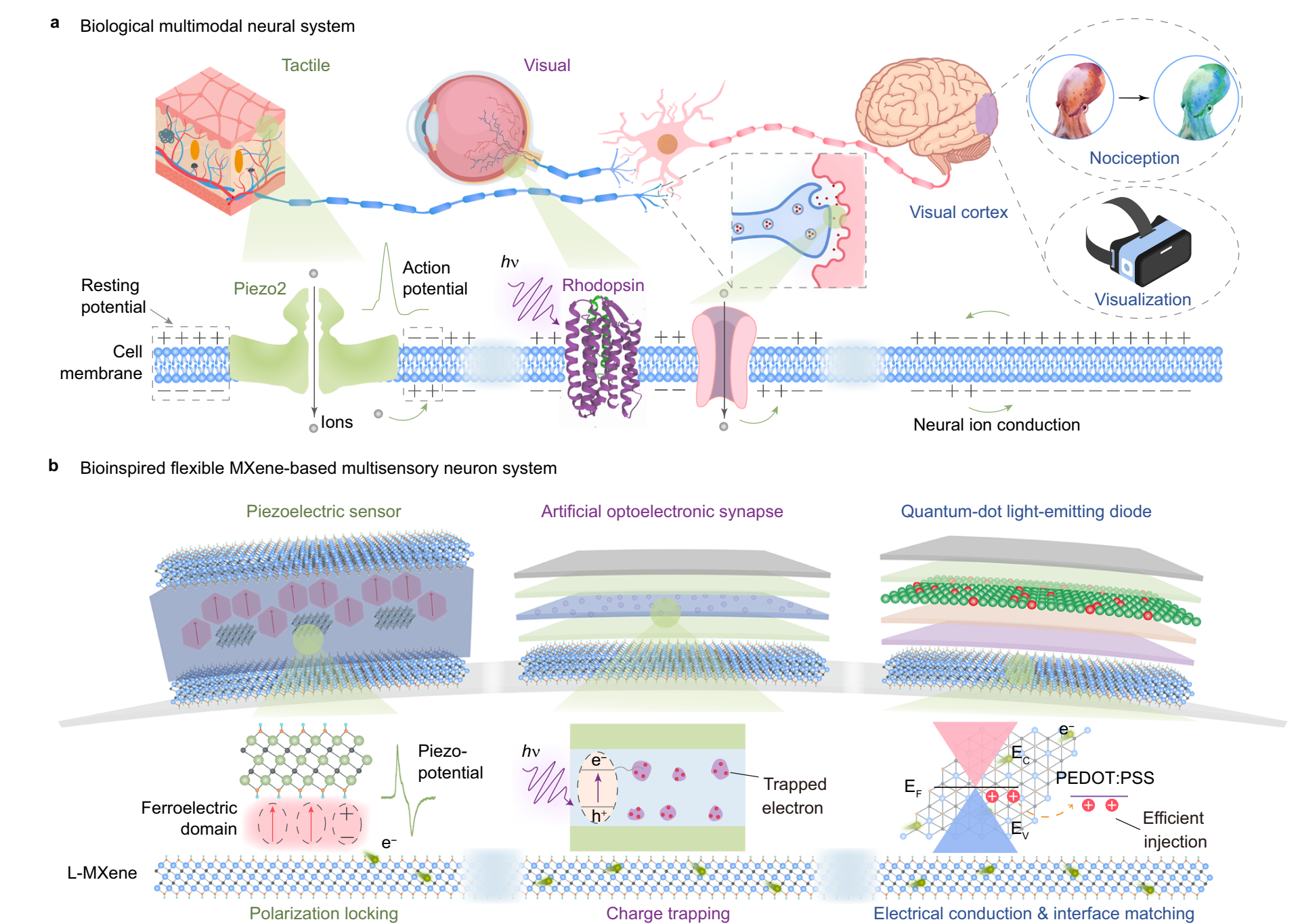 刘洋教授团队提出的仿生柔性智能系统以2D MXene作为共用界面,通过材料功能化调控,实现了压电纳米发电机(触觉感知)、光电突触器件(视觉感知与光电信息处理)以及量子点发光二极管(光学反馈)之间的无缝集成。实验结果表明,该柔性智能光电系统不仅能够实现触觉—视觉信号的协同识别,还展现出对环境刺激的自适应生物防护行为、动态轨迹识别以及面向运动感知的空间定位等功能特性。该研究为发展新一代可穿戴智能硬件、神经形态边缘计算系统及高效人机交互技术提供了新的研究思路。