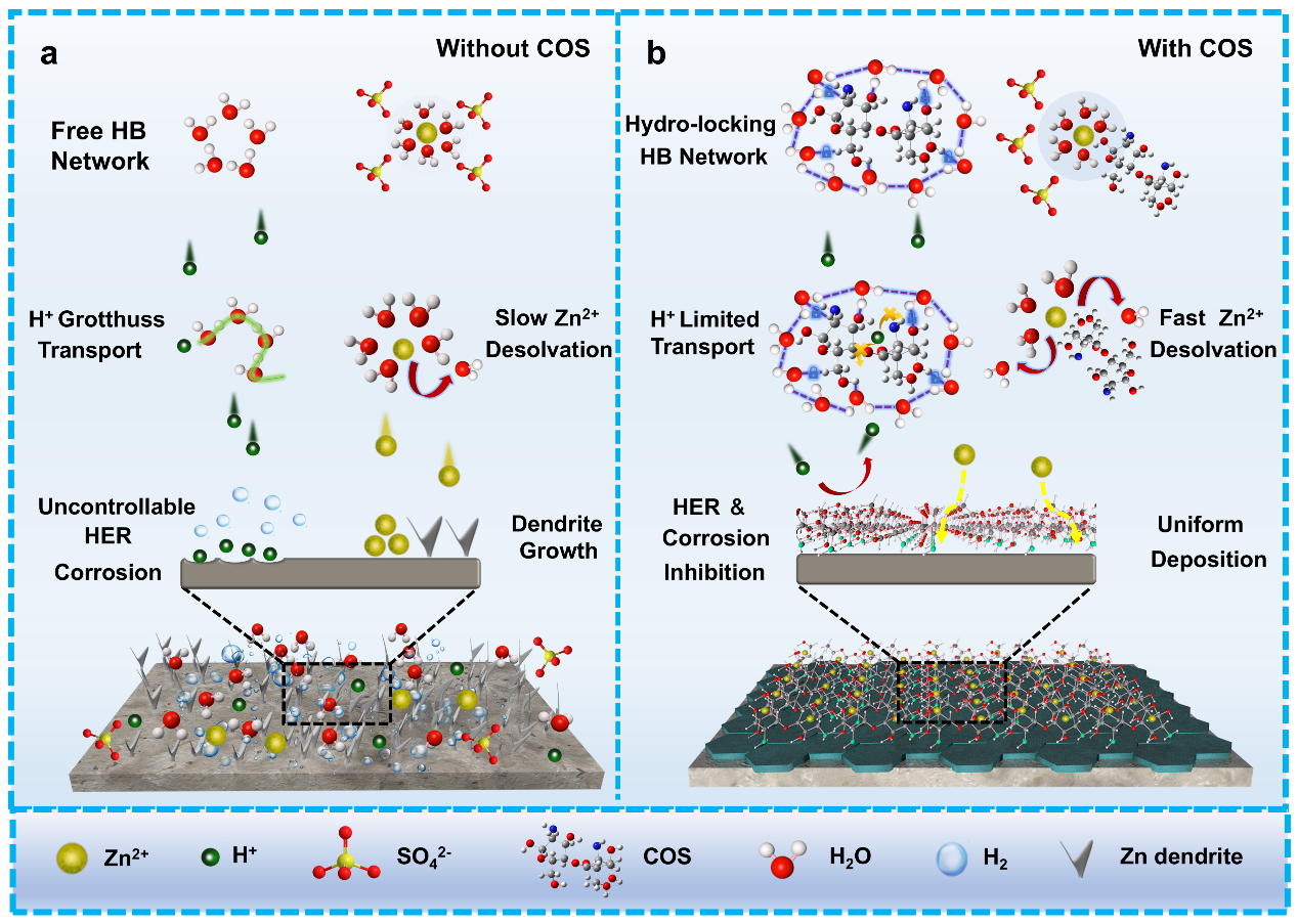 水系锌金属电池因其高安全性、低成本和丰富的资源,被视为大规模储能的重要候选技术。然而,锌负极寿命短一直是其应用中的一大挑战。该问题的根源在于水系电解液中活跃的质子,这些质子引发了局部pH波动、副产物沉积以及枝晶生长,最终导致库仑效率下降和循环寿命衰减。以往的电解液工程往往聚焦单一方面,未能在不影响Zn2+离子传输的情况下,协同调控质子的“生成—迁移—消耗”全过程,长期制约了水系锌电池的实用化进程。