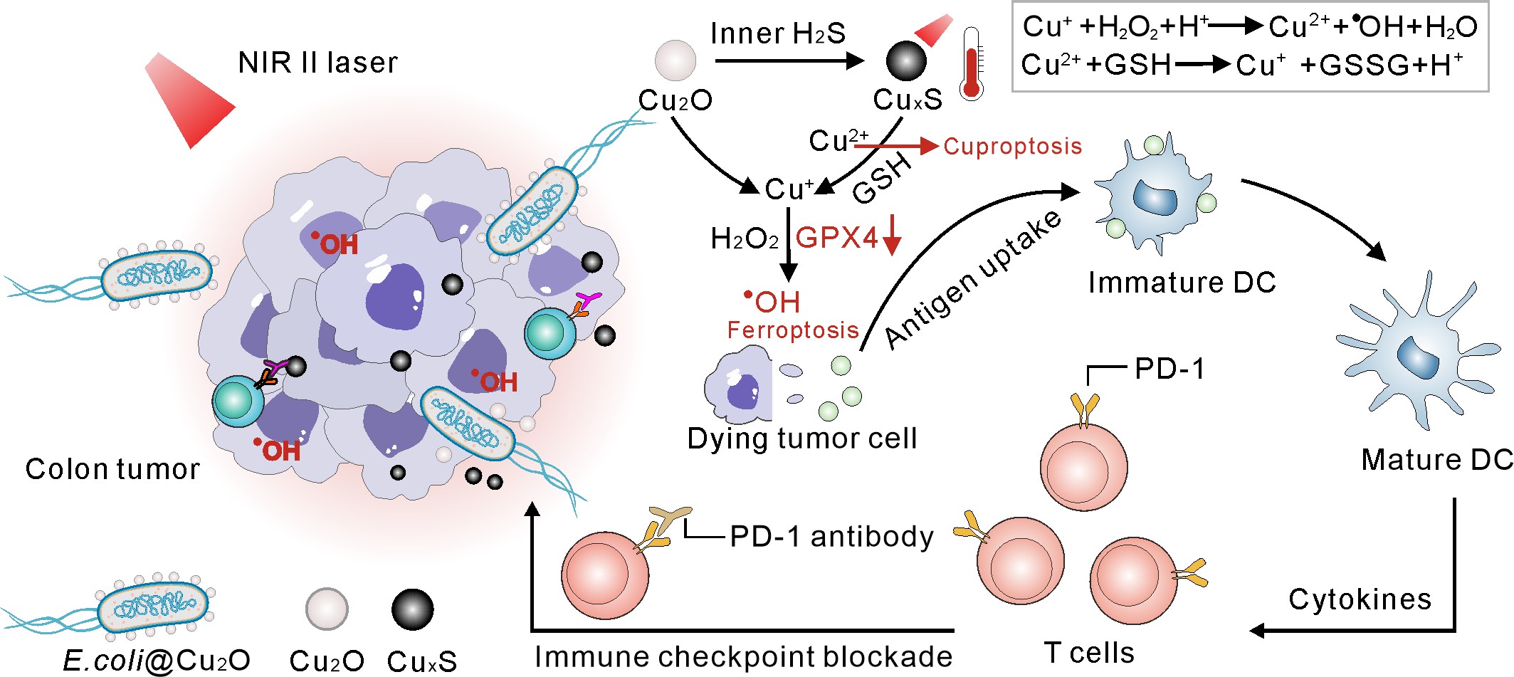 基于团队成员前期在工程化厌氧微生物菌开展的多个创新性工作的基础上(Adv. Healthcare Mater. 2020, 2000046;Chem. Eng. J. 452, 2023, 139517),西北工业大学黄维院士、福建师大海峡柔性电子研究院燕双仟教授团队与生命科学学院陈骐教授团队联合研发了一种工程化的微生物-纳米复合体,并将其用于结直肠癌的光热治疗,不仅可以激发肿瘤微环境的免疫反应,而且可以抑制肿瘤的远端转移。总体而言,该研究利用兼性厌氧微生物的乏氧靶向性,以其作为载体递送Cu2O纳米颗粒并与结肠癌微环境中的H2S发生化学反应生成具有极佳光热效果的黑色CuxS。本研究采用1064 nm激光进行光热治疗,其具有更好的穿透性和光热效果。在激光的照射下,CuxS不仅可以产生热量杀伤肿瘤细胞,同时还会释放出Cu+和Cu2+离子,可引起肿瘤细胞的铁死亡和铜死亡,起到协同治疗的作用。此外,光热治疗还可以激发机体的免疫反应,在抑制肿瘤远端转移方面作用显著。