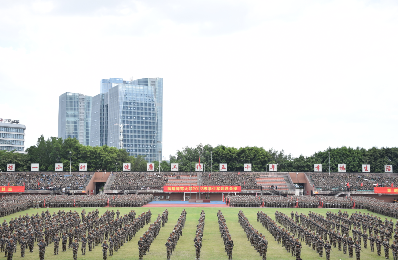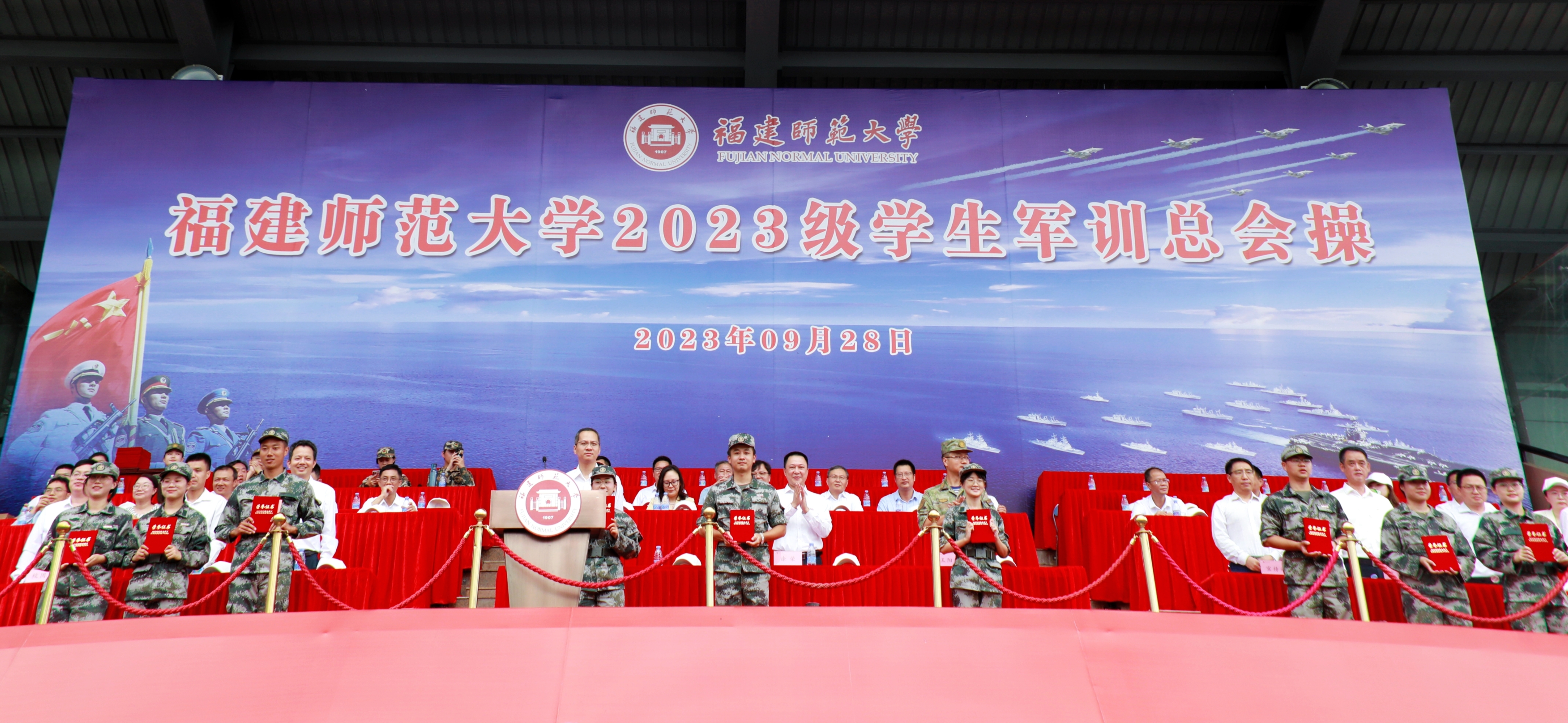 9月28日,J9·九游会「中国」官方网站在旗山校区东区田径场隆重举行2023级军训总会操。校党委副书记涂荣,军训团全体教官,军训工作领导小组成员单位、各学院分管学生工作负责人,2023级全体辅导员和学生参加了总会操。