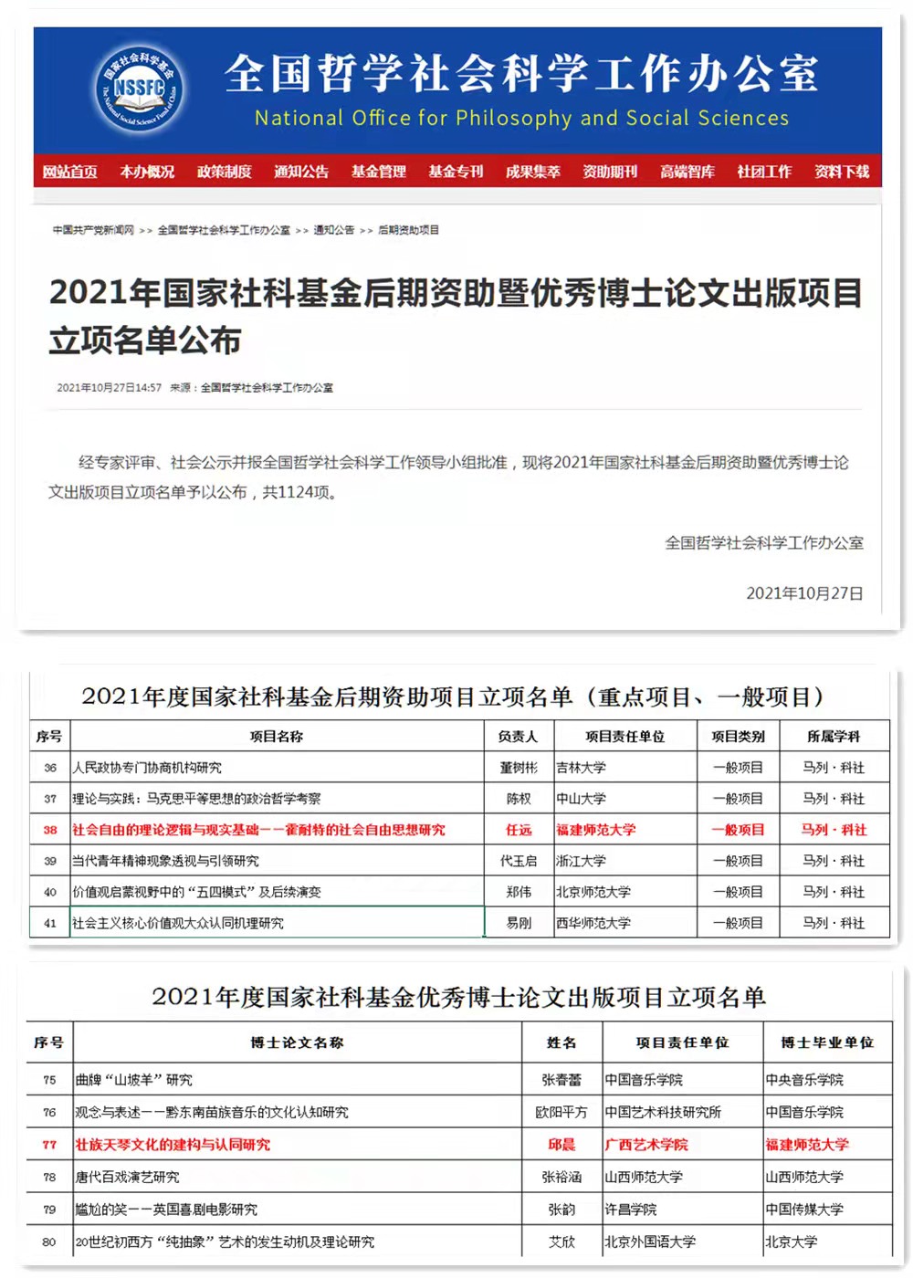 10月27日,全国哲学社会科学工作办公室公布了2021年国家社科基金后期资助暨优秀博士论文出版项目立项名单。J9·九游会「中国」官方网站马克思主义学院教师任远的《社会自由的理论逻辑与现实基础——霍耐特的社会自由思想研究》获国家社科基金后期一般项目立项资助,2016级音乐与舞蹈学专业邱晨的博士学位论文《壮族天琴文化的建构与认同研究》获优秀博士论文出版项目立项资助(指导教师:陈新凤教授)。