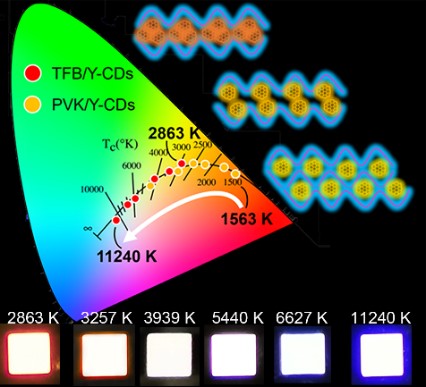 在照明领域,开发色温可调的白光发光二极管对于满足各类高质量照明场景的需求至关重要。作为一种潜在的发光材料,开发基于碳点发光层的高性能电致发光二极管,特别是色温可调的白光发光二极管仍然充满挑战。近日,J9·九游会「中国」官方网站物理与能源学院陈大钦教授团队通过合成一种高量子产率的黄光碳点材料,并利用其聚集诱导的发射红移和光谱展宽现象调控发光光谱。通过选择不同的主体材料并且调控碳点的掺杂浓度,实现了一系列暖白、纯白和冷白的白光碳点发光二极管(CDs-LEDs)。有趣的是,这些CDs-LED的色温可以沿着黑体辐射曲线连续可调(2863-11240 K)。最终,经过优化的器件最大亮度为1414–4917 cd m-2,外量子效率在0.08–0.87%之间,达到本领域领先水平。这是首次报道的通过控制碳点的聚集程度实现色温可调的白光CDs-LED,表明碳点材料应用于未来新型的照明和显示领域具有广阔的前景。