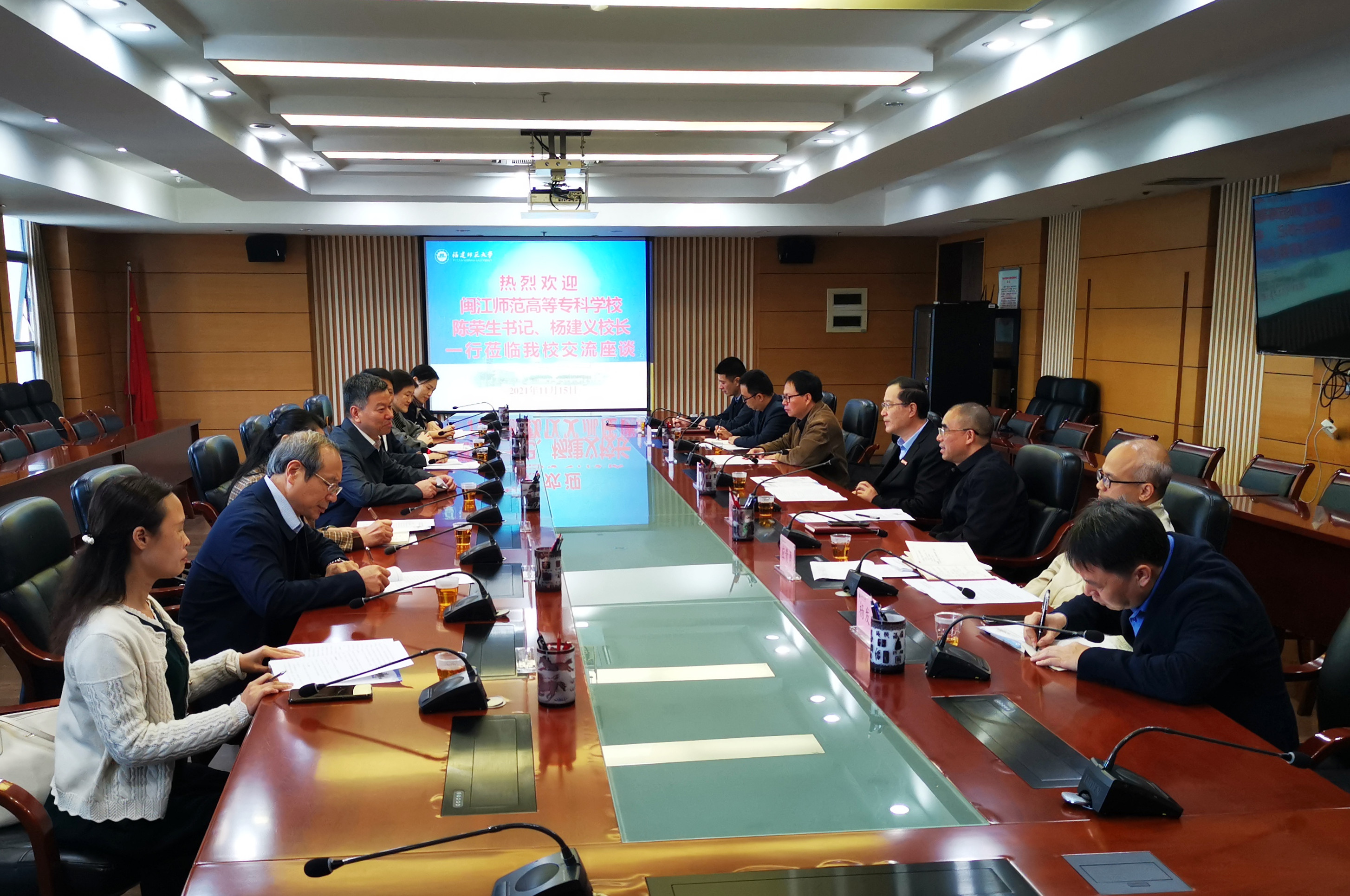 11月15日,闽江师范高等专科学校党委书记陈荣生、校长杨建义、副校长林旻带领办公室、教务处、教科所、初等教育系有关负责人来校调研交流。校领导王长平、郑家建,党政办公室、教务处、招生与考试办公室、发展规划处、教育学部有关负责人参加了座谈会。