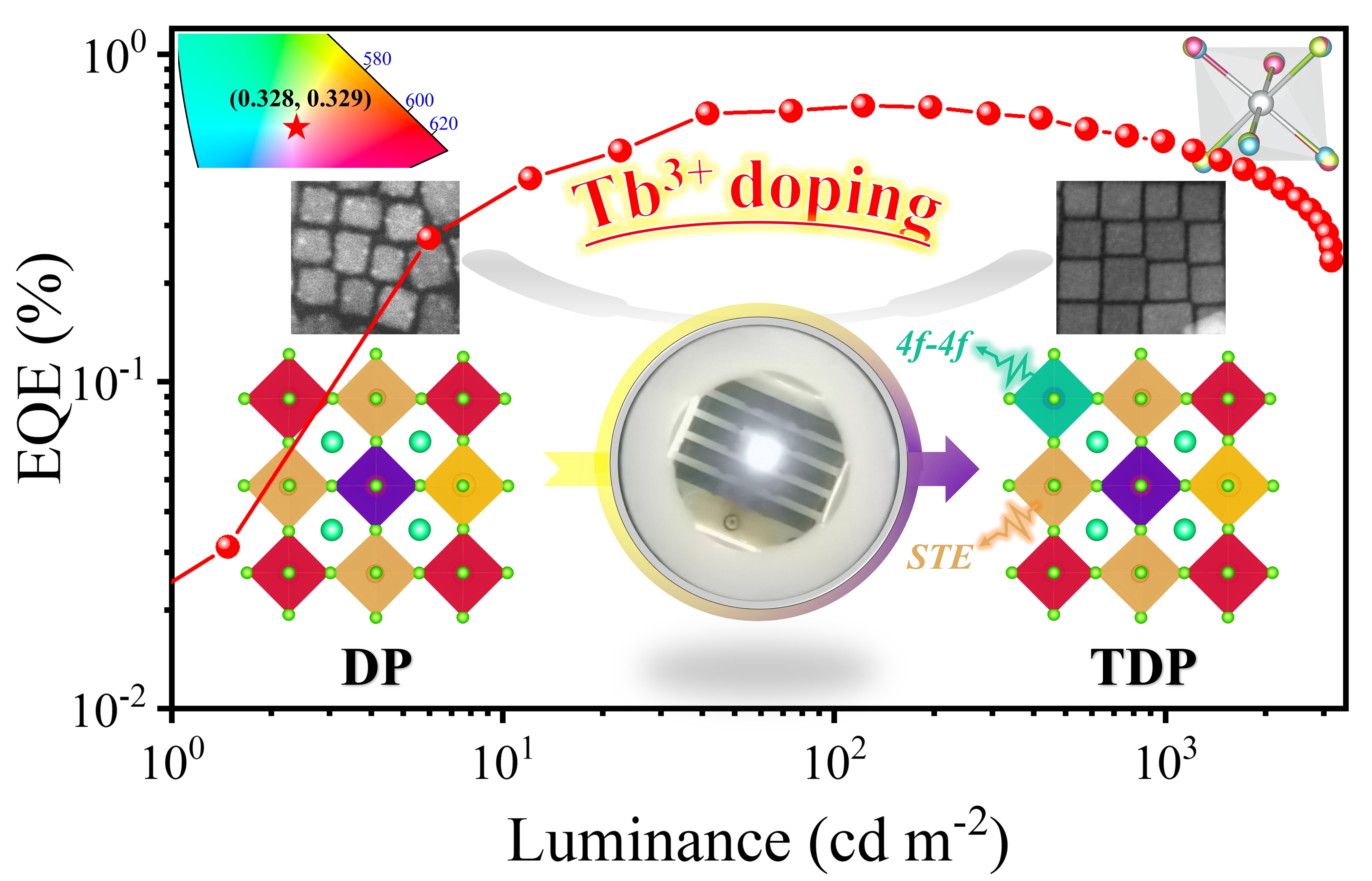 基于此,研究团队采用稀土Tb掺杂和主-客体策略实现了器件的电流效率从0.110 cd A-1提升到0.634 cd A-1,EQE从0.08%提升到0.76%,亮度从158 cd m-2提升到2793 cd m-2。这归因于通过Tb掺杂有效抑制银纳米颗粒生长、助力形成空间限域的自限激子态和降低局域对称性,以及通过主-客体策略明显改善薄膜形貌、降低缺陷密度和优化载流子传输能力。此外,通过在器件中引入额外的绿色碳量子点补偿缺失的绿光成分,获得具有理想色坐标(0.328,0.329)和卓越光电性能的纯白电致发光。