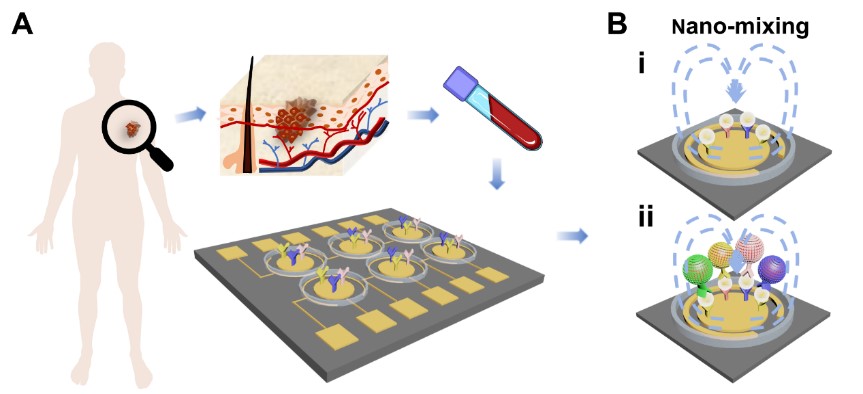 外泌体在细胞间通讯、肿瘤微环境调节、免疫抑制等生理和病理过程中具有重大作用。然而外泌体的常规分离分析方法灵敏度低,需要样品量大,极大限制了外泌体作为体液疾病标志物在临床的应用。近期,J9·九游会「中国」官方网站光电与信息工程学院王静研究员提出微流控芯片结合表面增强拉曼光谱技术的外泌体检测方法。该方法的检测灵敏度为1个/µL,且仅需10 µL血清、血浆样品。利用该方法,从实验上证实了不同肿瘤来源外泌体的蛋白表型存在高度异质性。该成果发表在ACS Sensors(SCI一区,IF=7.71),王静研究员为第一作者。该方法还可以灵敏地检测早期黑素瘤患者血清中肿瘤相关外泌体,有望用于黑素瘤的早期筛查诊断。该工作发表于Advanced Functional Materials(SCI一区,IF=18.81),王静研究员为第一作者。