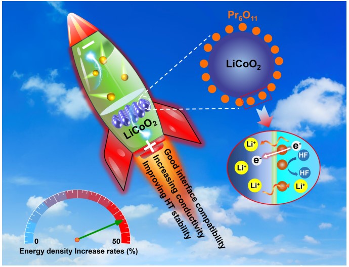 近期,我院李加新副教授、黄志高教授和赵桂英老师,联合厦门大学谢清水特任研究员,创新性地发展了一种简单的量产策略——将具有负温度系数热敏特性的Pr6O11纳米颗粒均匀地修饰在常压LiCoO2材料表面(复合材料标记为LCO@PrO),实现复合材料在高电压下的循环容量、寿命及热安全等电池性能显著改善,并显著提升其全电池的功率密度,对钴酸锂材料的实际应用产生重要启示。