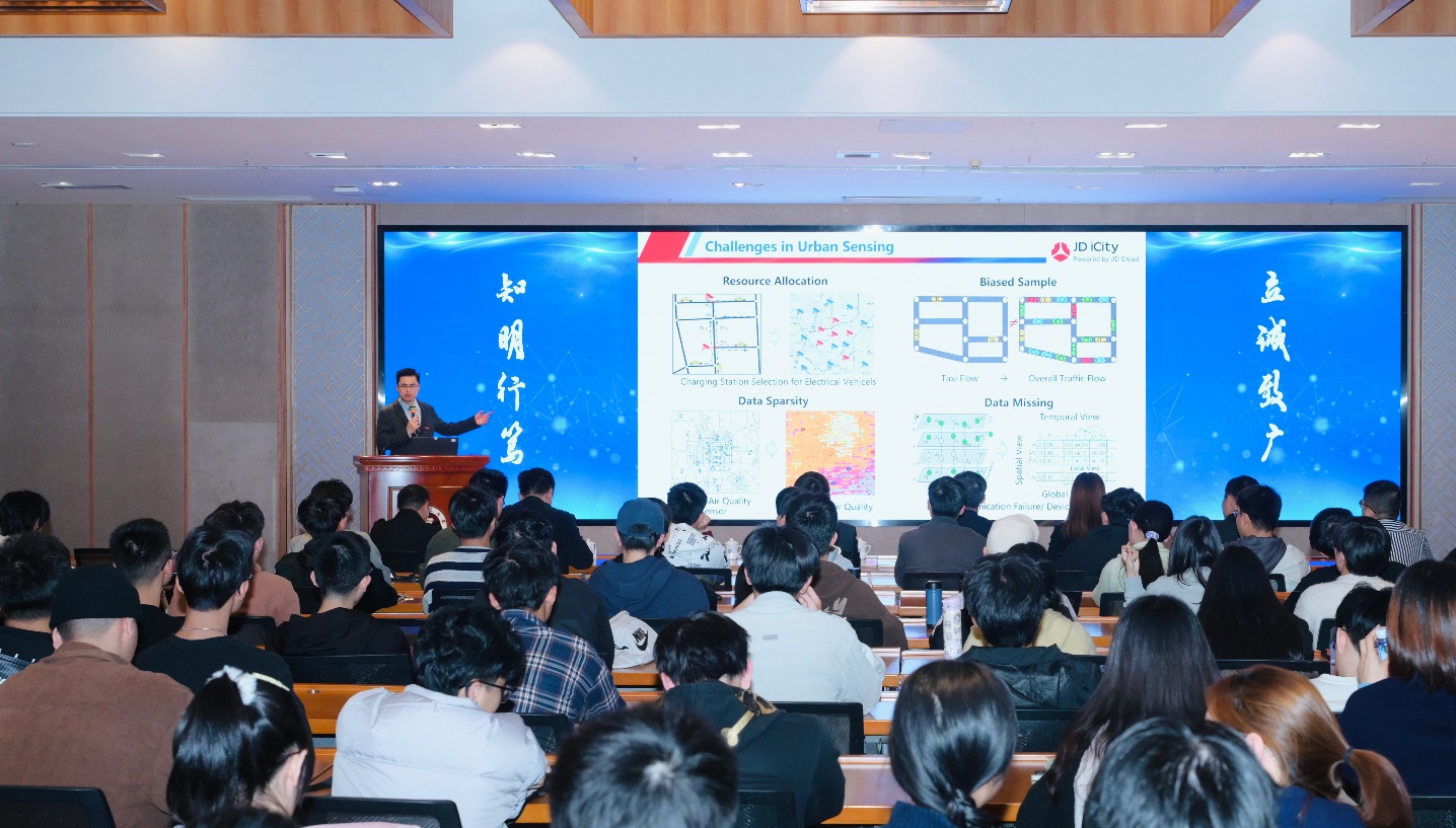 仪式后,郑宇教授作了题为《城市计算:从理论体系到产业实践》的学术讲座,深入浅出地阐述从城市计算理论体系到城市操作系统产品研发,再到产业实践的过程,分享其中的科学问题、关键技术和落地案例。讲座现场气氛热烈,师生交流互动积极。