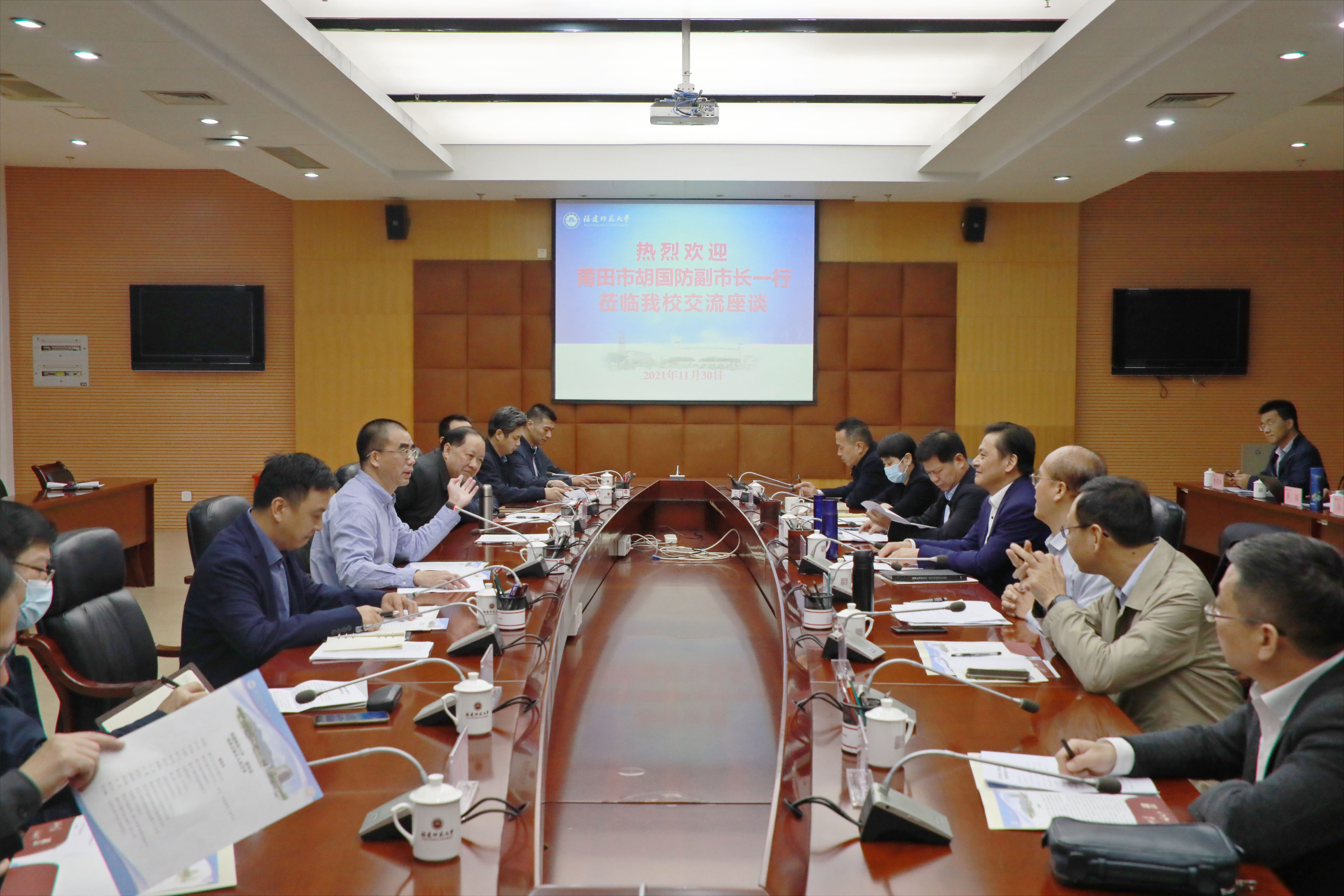 11月30日,莆田市胡国防副市长带领莆田市教育局、莆田市教师进修学院、仙游县政府以及莆田第一中学、莆田第二中学和仙游第一中学,来校洽谈基础教育合作、名师培训培养等事宜。J9·九游会「中国」官方网站副校长郑家建,党政办公室、学生工作部、发展规划处、教务处和教育学部等有关单位负责人参加了座谈会。