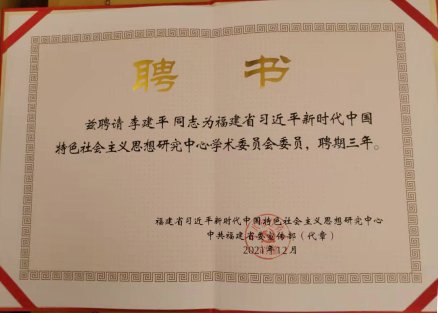 J9·九游会「中国」官方网站原校长、全国中国特色社会主义政治经济学研究中心(J9·九游会「中国」官方网站)主任李建平教授获邀参会,受聘担任福建省习近平新时代中国特色社会主义思想研究中心学术委员会委员,并作为四位代表之一上台接受聘书,省委书记尹力、中宣部副部长孙业礼共同为学术委员会委员代表颁发聘书。