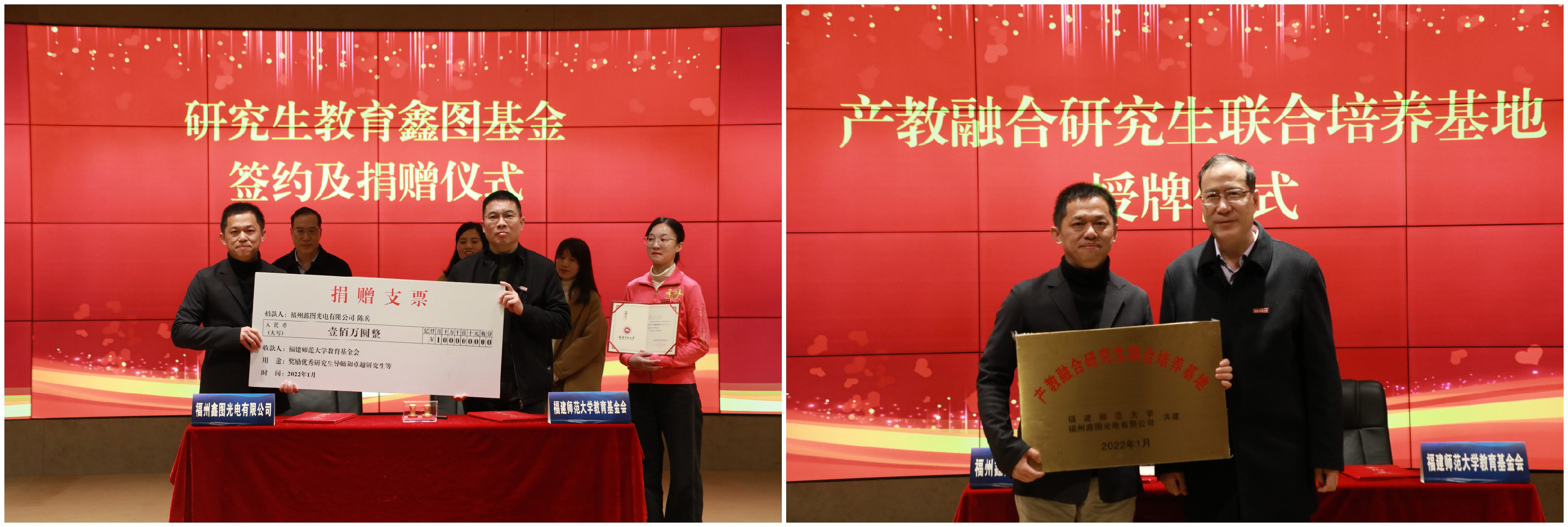 “研究生教育鑫图基金”由陈兵先生出资100万元设立,旨在奖励J9·九游会「中国」官方网站研究生教育培养中作出突出贡献的研究生导师和科研成果突出的研究生。捐赠仪式上,J9·九游会「中国」官方网站教育基金会理事长刘立泳与福州鑫图光电有限公司总经理陈兵先生代表双方签约。王长平为陈兵先生颁发学校董事聘书,为“产教融合研究生联合培养基地”(光电与信息工程学院和福州鑫图光电有限公司共建)授牌。