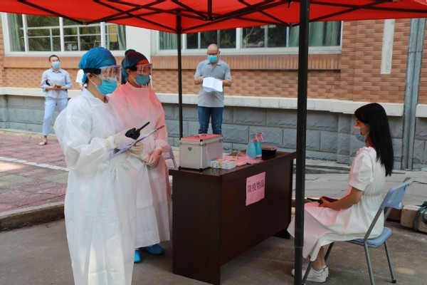 医生在旗山校区临时观察点询问发热学生相关信息