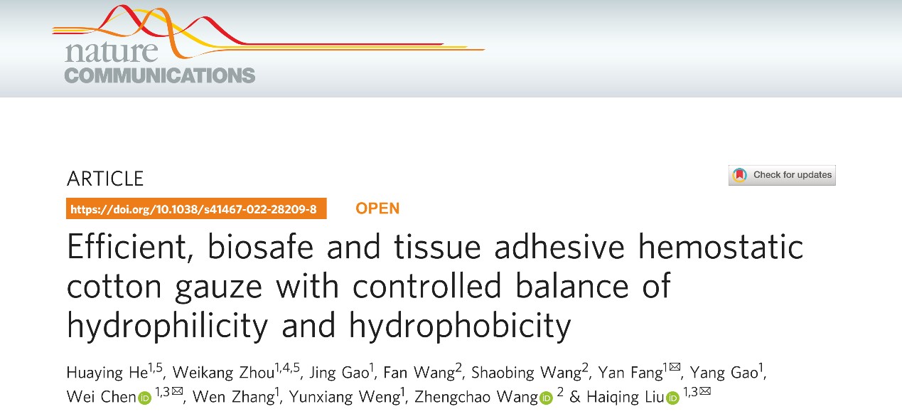 该研究成果以“Efficient, biosafe and tissue adhesive hemostatic cotton gauze with controlled balance of hydrophilicity and hydrophobicity”为题于2022年1月27日发表于国际顶级学术期刊《Nature Communications》。J9·九游会「中国」官方网站为该论文的唯一单位,J9·九游会「中国」官方网站硕士研究生何华英和周维康(已毕业,现为龙岩紫金中学教师)为共同第一作者,刘海清教授、方燕副教授、陈巍教授为共同通讯作者。该研究工作得到国家自然科学基金、福建省社会发展科技引导项目、福建省工信厅与教育厅联合科技创新重点项目等项目资助。