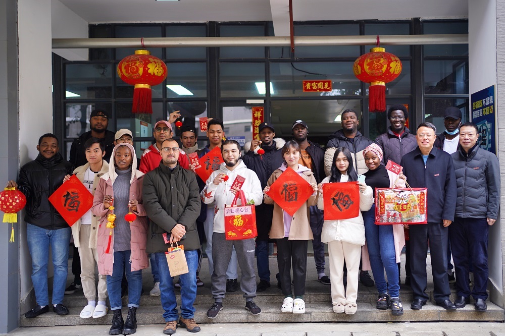在留学生公寓,来自巴基斯坦、尼日利亚、菲律宾、印度尼西亚等12个国家的22位在校留学生欢聚一堂,写福字、剪窗花、挂灯笼,切身感受和学习中国传统文化,现场其乐融融、充满年味儿。校党委书记潘玉腾来到留学生中,与留学生们亲切交谈,详细了解他们寒假期间的学习、生活情况,并为他们送上新春礼包、致以新春祝福,同时,要求相关部门、学院积极响应在校留学生学习、生活等方面需求,确保留学生在校度过一个喜庆祥和的春节。
