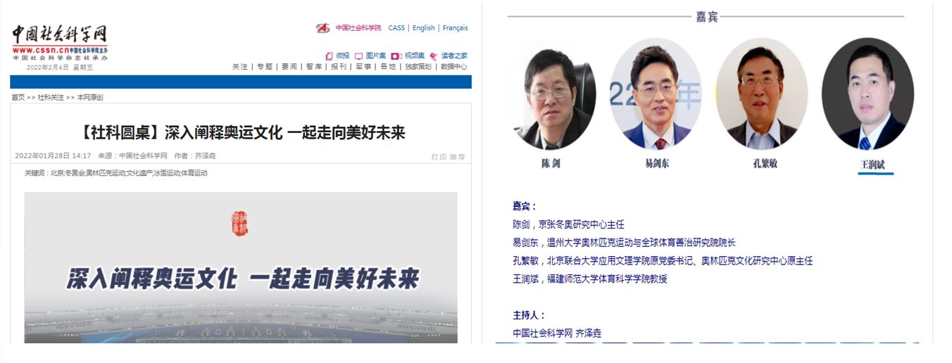 1月28日,中国社会科学网以《深入阐释奥运文化一起走向美好未来》为题,刊发冬奥专题文章。文章采访了王润斌教授等四位国内奥林匹克研究专家,就奥林匹克运动对人类社会发展贡献、奥林匹克运动与中国传统体育文化交流、北京冬奥会对世界发展与中国进步影响、如何承继奥运文化遗产弘扬奥林匹克精神等主题进行了深入探讨。