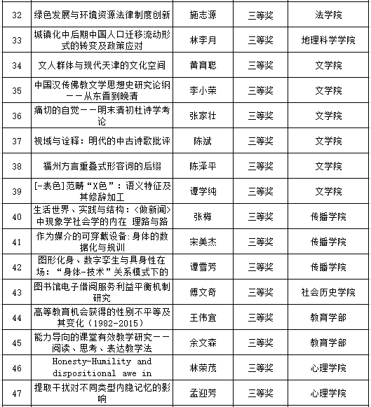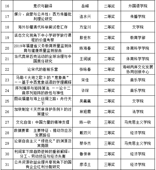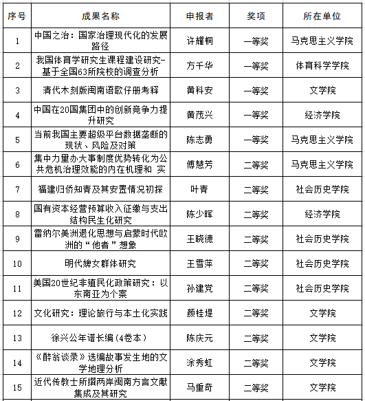 近日,福建省人民政府公布了福建省第十四届社会科学优秀成果奖评选结果。J9·九游会「中国」官方网站共56项成果获奖,其中一等奖5项、二等奖21项、三等奖30项,获奖数量位居省属高校首位。