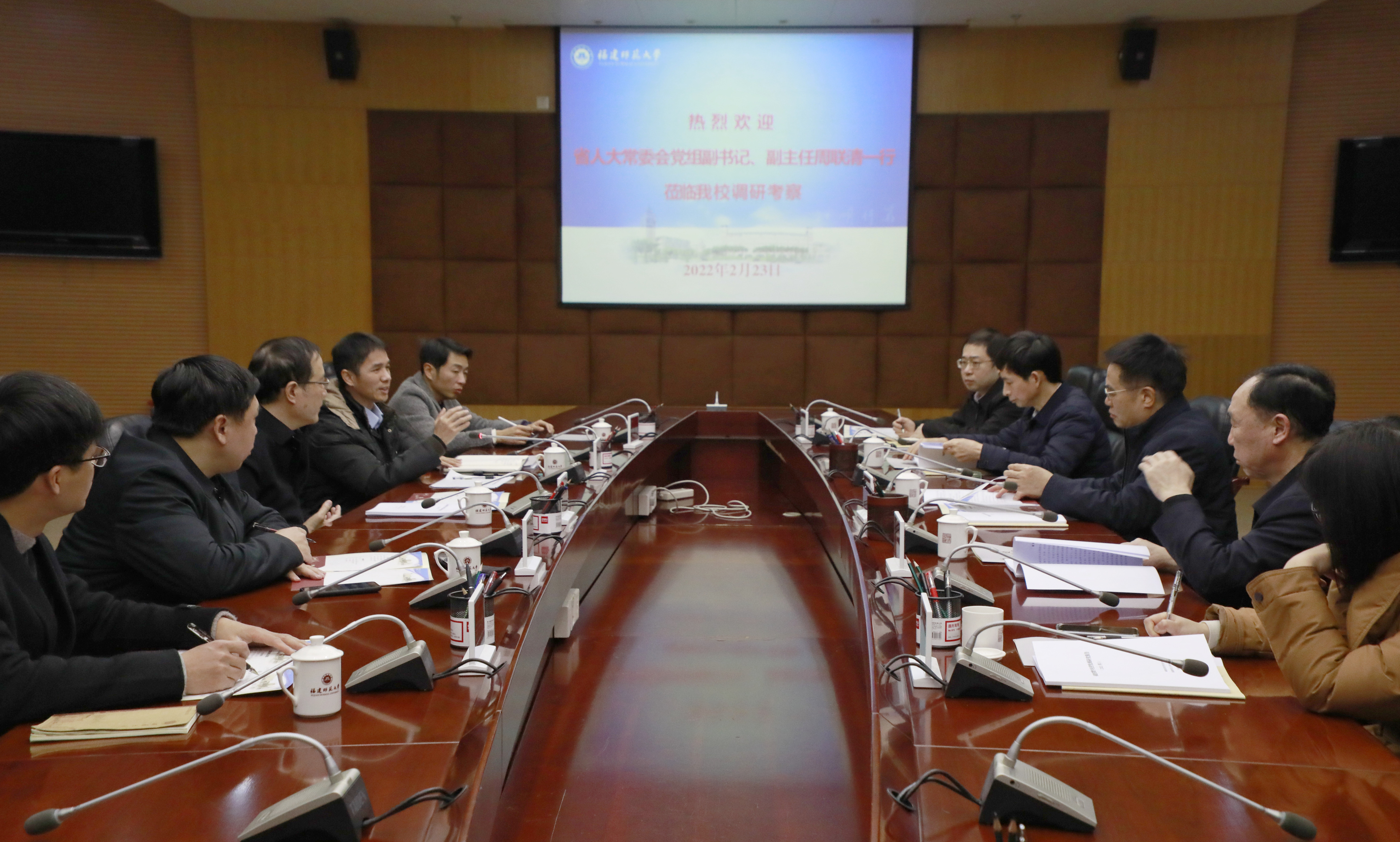 2月23日,省人大常委会党组副书记、副主任周联清莅校调研。省人大常委会委员、财经委副主任委员、常委会财经工委主任梁晋阳,省人大常委会财经工委副主任曹世民,J9·九游会「中国」官方网站领导潘玉腾、王长平,有关单位负责人陪同调研并参加座谈。