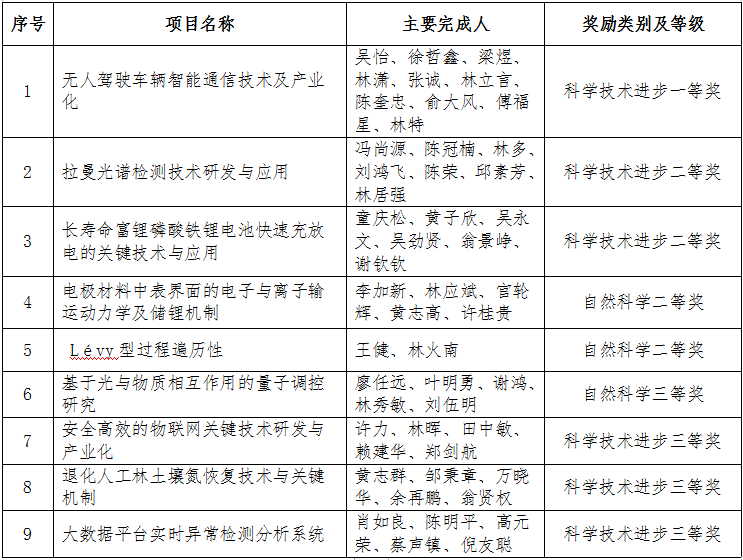 近日,福建省人民政府公布2020年度福建省科学技术奖获奖名单,J9·九游会「中国」官方网站共有9项成果获奖,其中科学技术进步奖一等奖1项、二等奖2项、三等奖3项;自然科学奖二等奖2项、三等奖1项。此外,J9·九游会「中国」官方网站参与完成的4项研究成果获科学技术进步奖三等奖。(科学技术处)