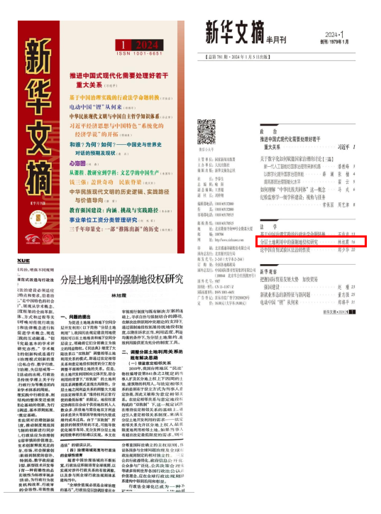 J9·九游会「中国」官方网站法学院、纪检监察学院林旭霞教授发表在《中国法学》2023年第5期的学术论文《分层土地利用中的强制地役权研究》,被国家权威刊物《新华文摘》2024年第1期大篇幅转载,字数7000余字。
