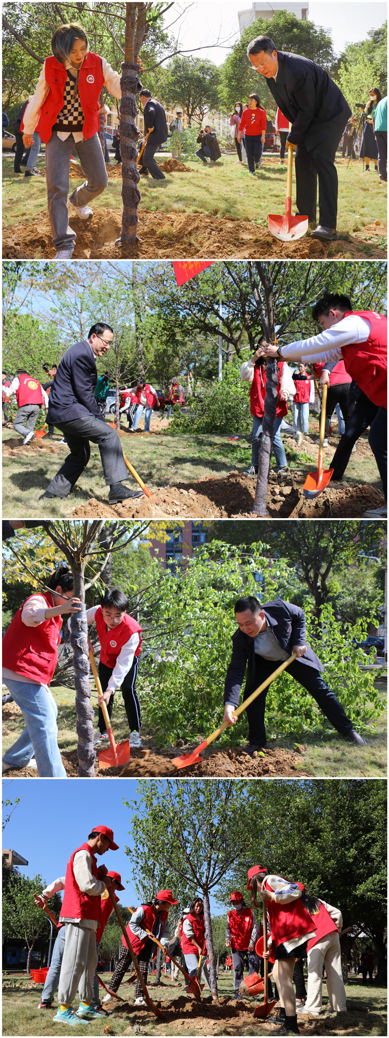 启动仪式后,“美化校园环境 共建文明校园”主题活动如火如荼地在校园内开展。校领导与志愿者代表共同参加了植树活动,在翠竹园餐厅东侧绿地植下50株福建山樱花,打造校园风景新的“打卡点”。文明校园志愿服务队卫生分队、交通分队开展了美化校园志愿服务和文明交通志愿服务。