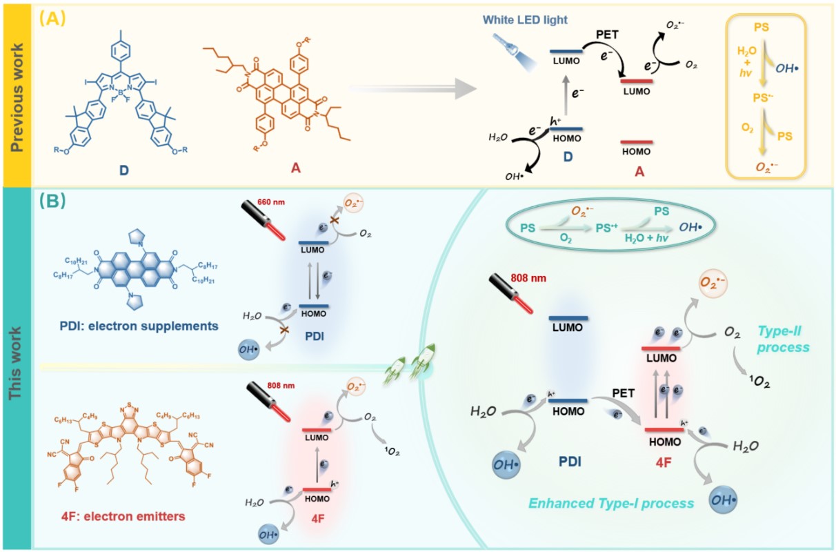 I型光动力治疗技术被认为具有更好的耐缺氧性能,开发I型光敏剂为解决传统光动力疗法固有的氧消耗和缺氧肿瘤微环境导致的光动力疗法疗效不足的问题提供了一种行之有效的方法。目前设计构建I型光敏剂的挑战在于如何促进光敏化分子的电子转移能力,以便将氧或水分子转化为生物毒性的活性氧(ROS)。