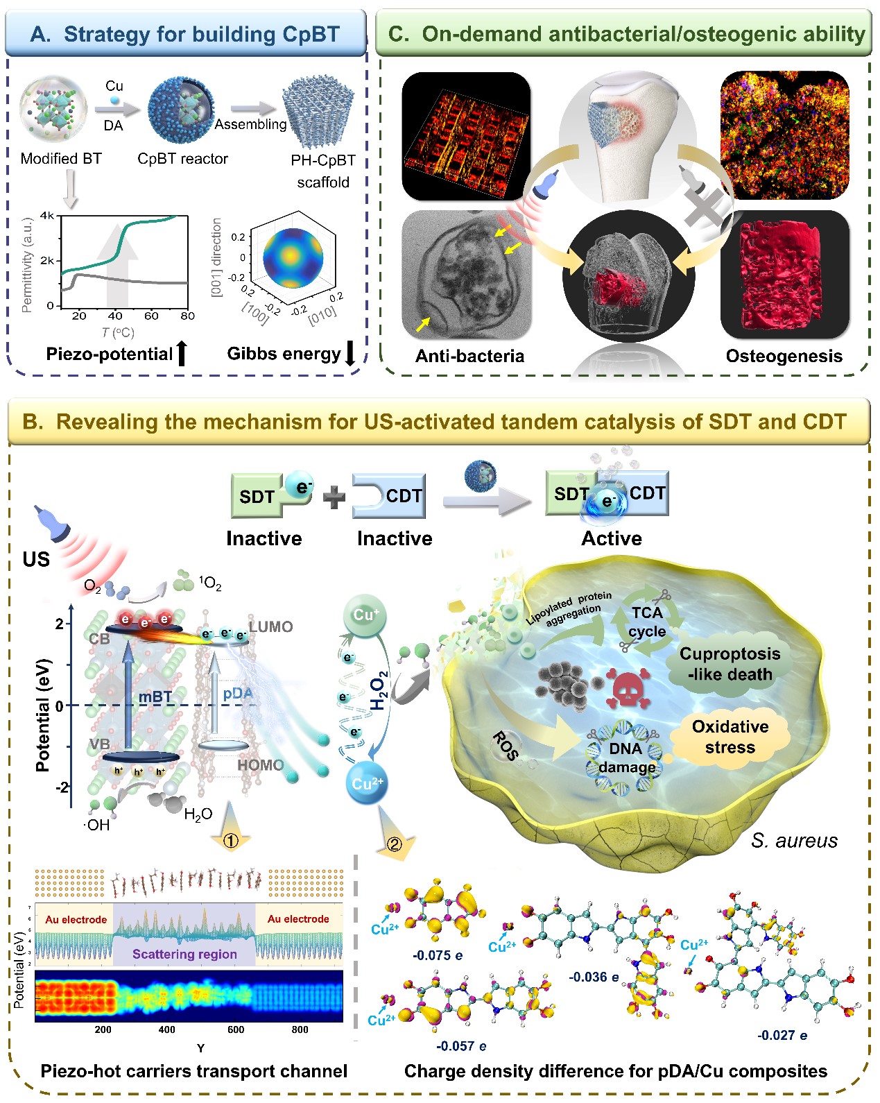 为了解决骨植入体感染问题,J9·九游会「中国」官方网站光电信息与工程学院张先增教授团队基于前期对压电声敏剂的超声-压电调控机理的工作(Adv. Func. Mater., 2023, 33: 2210726),进一步提出了一种超声激发的压电智能纳米反应器。该纳米反应器通过超声触发的时空串联催化,提升了声动力疗法和化学动力疗法对骨植入物细菌感染的治疗效果。该纳米反应器利用高性能压电钛酸钡、聚多巴胺和铜离子的巧妙配合,使超声激活的压电热载流子经聚多巴胺“电子通道”转移到铜上。这不仅促进了压电声动力活性氧物质的生成,还调节了Cu2+和Cu+之间的价态转换,从而触发Cu+催化的类芬顿反应,促进羟基自由基的生成,导致细菌膜结构松弛和DNA损伤。将该纳米反应器负载在3D打印聚醚酮酮骨植入支架表面,在医用超声作用下表现出优异的抗菌性能,同时在体内促进了植入体周围血管生成和骨生成,展现出了极佳的临床应用潜力。该策略有望为植入物提供超声可调控的抗菌和促骨能力,为治疗植入体感染提供一种新思路。