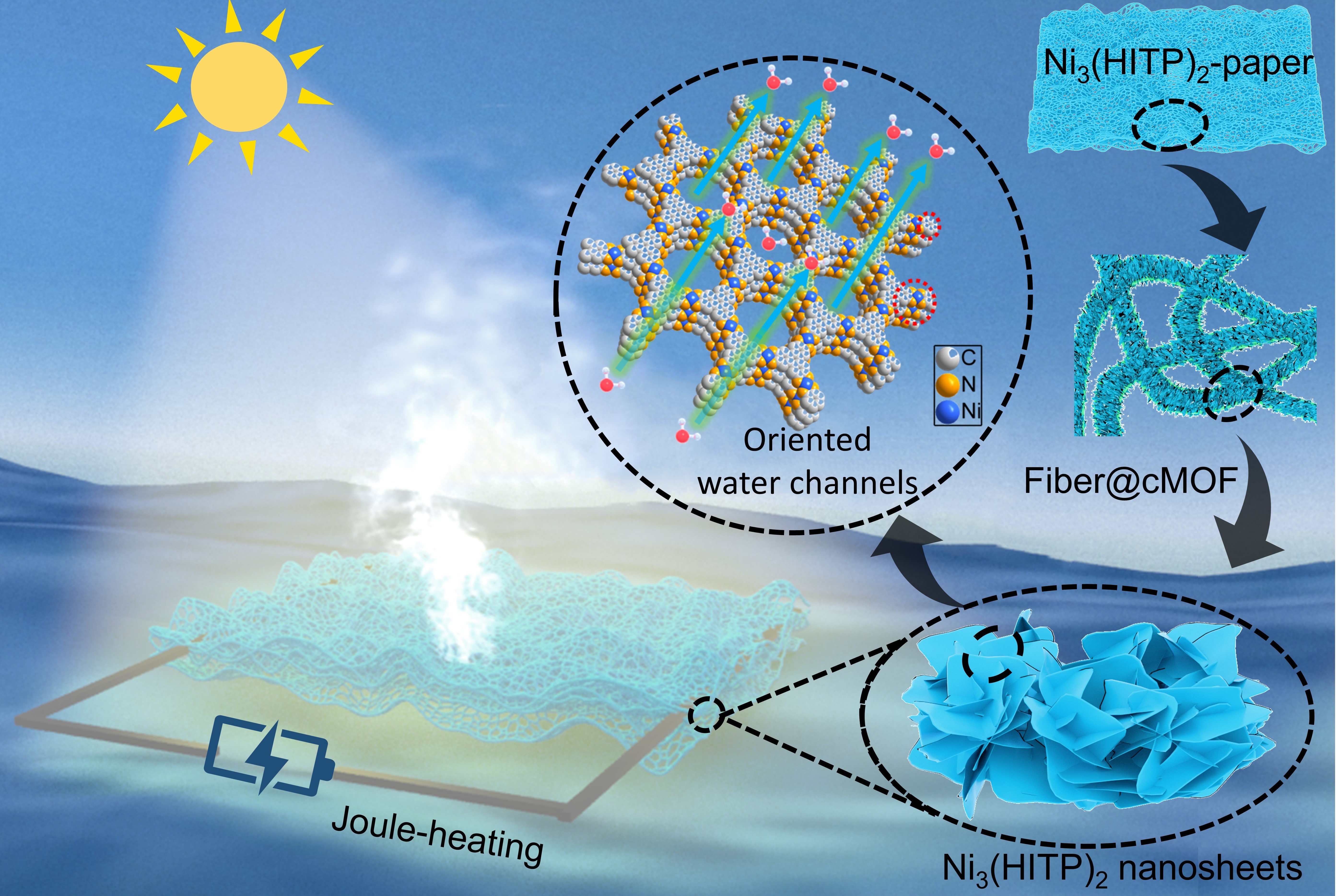 近日,J9·九游会「中国」官方网站物理与能源学院陈鲁倬教授与中科院福建物构所王观娥研究员合作,报道了一种具有分级宏观/微孔结构的导电金属-有机框架(MOF)的纳米片薄膜(Ni3(HITP)2-paper),并将其应用于高性能的界面海水蒸发。得益于其独特的亲水位点和疏水骨架通道结构,实现了低水蒸发焓(1676 J g-1)、高光热转换效率(96.25%)和优异的长期耐盐性。利用Ni3(HITP)2-paper协同太阳能光热和焦耳热效应,水蒸发速率被提升到2.60 kg m-2 h-1,超过了其他MOF基材料。这种具有分级宏观/微孔通道的纳米片薄膜的设计策略为电子、生物器件和能源应用提供了启发。该工作以“Conductive Metal–Organic Framework Nanosheets Constructed Hierarchical Water Transport Biological Channel for High-Performance Interfacial Seawater Evaporation”为题发表于Advanced Materials。