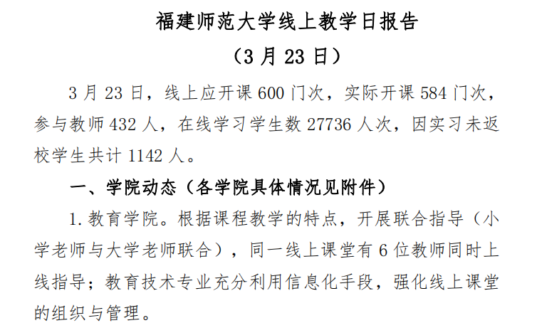 各学院坚持与学校同心同行,自主结合学科专业特点,针对性开展线上教学各项工作,专任教师积极探索线上课堂管理、线上实验教学等工作;教务处编制《线上教学运行日报告》,分享各学院线上教学典型经验、优秀课程案例,有力推动线上教学工作平稳、有序、有效开展,共同打造了疫情期间各学院的“线上教学共同体”。