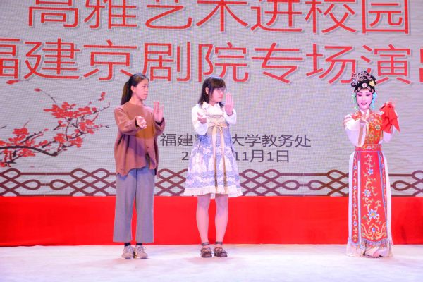 据悉,福建省京剧院已有70年建院历史,2005年被文化部评为“省级重点京剧院团”。本次个性化培养周邀请福建京剧院高雅艺术进校园,为全校师生带来一场体验国粹艺术的盛宴,搭建了一个亲近艺术、聆听大师、感受艺术魅力的平台。