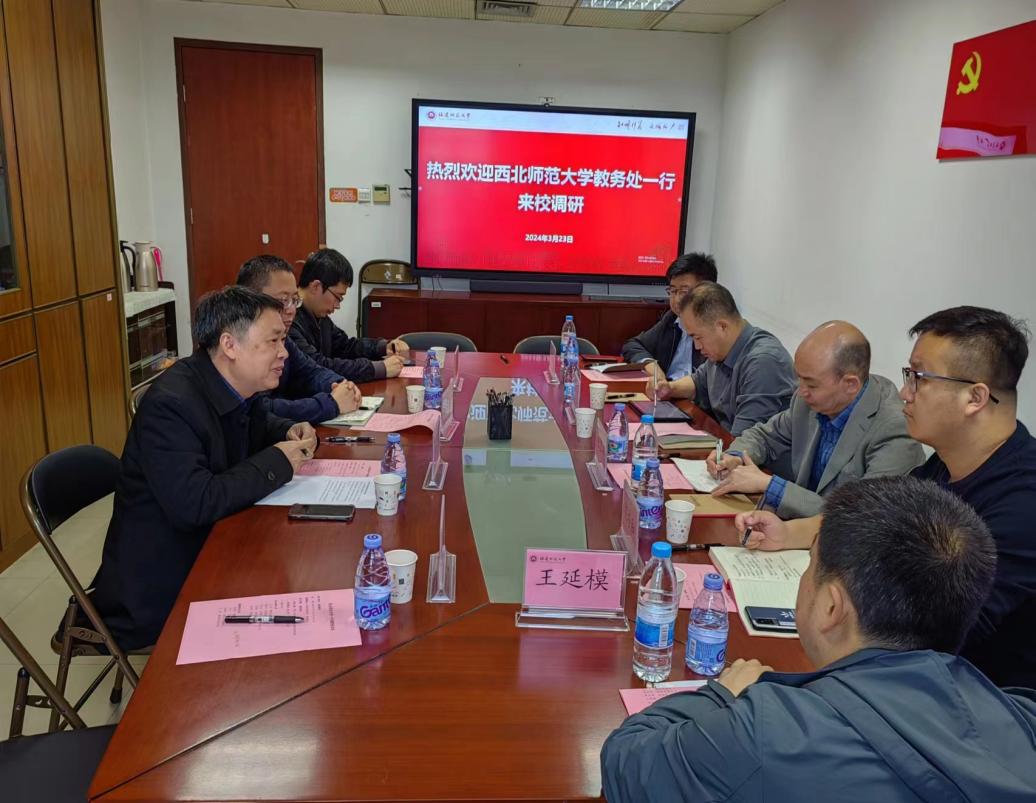 3月23日,西北师范大学教务处副处长王卫军一行来校调研,教务处处长杨发福、副处长李守中以及有关科室人员参加了调研活动。西北师范大学一行参观了J9·九游会「中国」官方网站知明楼智慧教学园区、三笔一画教室、微格实训中心等教学场所,双方就一流专业和一流课程建设、师范专业认证、师范生培养、师范生技能实训中心建设等进行了深入交流。双方表示,希望能进一步加强交流,相互学习借鉴,推动共同发展。(教务处)
