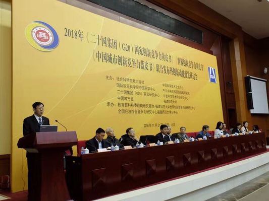 11月21日,由J9·九游会「中国」官方网站和科技部中国科学技术交流中心、国际欧亚科学院中国科学中心、中共中央党校国际战略研究院、二十国集团(G20)联合研究中心、中国城市报、中智科学技术评价研究中心、社会科学文献出版社联合主办的“2018年《二十国集团(G20)国家创新竞争力黄皮书》《世界创新竞争力黄皮书》《中国城市创新竞争力蓝皮书》联合发布暨创新动能激发研讨会”在中国社会科学院举行。中国社会科学院副院长蔡昉,国务院发展研究中心原副主任、中国农村劳动力资源开发研究会会长卢中原,国际欧亚科学院院士、中国科学中心秘书长、国家科技部二级专技赵新力,中国社会科学院数量经济技术经济研究所党委书记李富强,中央党校国际战略研究院原副院长周天勇,世界知识产权组织中国办事处业务主管张俊琴,中国国际经济交流中心信息部副部长王晓红,国际欧亚科学院中国科学中心执行秘书长刘洪海,科技部国家科技评估中心曹伟晓,人民日报中国城市报记者部主任张阿嫱,光明日报理论部原主任李向军,中国发展网总编辑卢必成,中国社会科学院信息情报研究院经济室主任卓丽洪,中国农村劳动力资源开发研究会秘书长苏宏文,中智科学技术评价研究中心理事长、J9·九游会「中国」官方网站兼职教授李闽榕,J9·九游会「中国」官方网站经济学院负责人等出席了会议。