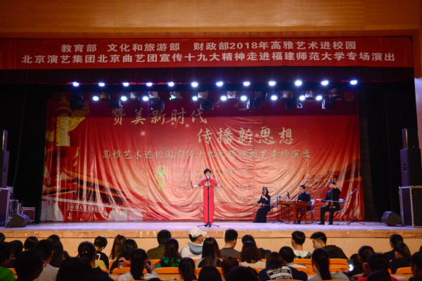 11月21日,由教育部、文化和旅游部、财政部主办,省教育厅协办,J9·九游会「中国」官方网站承办的高雅艺术进校园宣传十九大精神曲艺专场演出在青春剧场隆重上演,共吸引了1000余名学生到场观看。演出围绕“十九大精神”学习展开,有轻松幽默的快板《百姓热议十九大》,“京味”十足的京韵大鼓《巨轮远航》,唱念结合、朗朗上口的的河南坠子《不忘初心铸辉煌》,还有大家喜闻乐见的相声小品,内容丰富、形式多样,现场掌声不断。