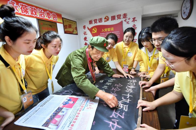 11月8日,全国第21个记者节,福建师大协和学院学生记者站党支部全体党员来到位于福州市仓山区的黄以孟党员志愿服务站,与抗美援朝老战士黄以孟一起出主题黑板报,共话理想责任,以实际行动学习宣传贯彻党的十九届五中全会精神。(协和学院)