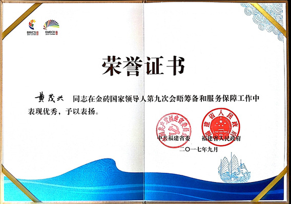 At the meeting, Liang Jianyong, Member and Secretary-General of the Standing Committee of the CPC Fujian Provincial Committee read out the notification that the CPC Fujian Provincial Committee & Fujian Provincial People’s Governmenthonor the advanced collectives and individuals in preparations of service security forthe BRICS Xiamen Summit. FNU National Economic Comprehensive Competitiveness Research Branch Center (the Center) was awarded as “Advanced Collective in preparations of service security forthe BRICS Xiamen Summit”. Professor Huang Maoxing, executive deputy director of the Center, and Lan Xiaolin, a doctoral student, were awarded as “Advanced Individuals in preparations of service security forthe BRICS Xiamen Summit”.
